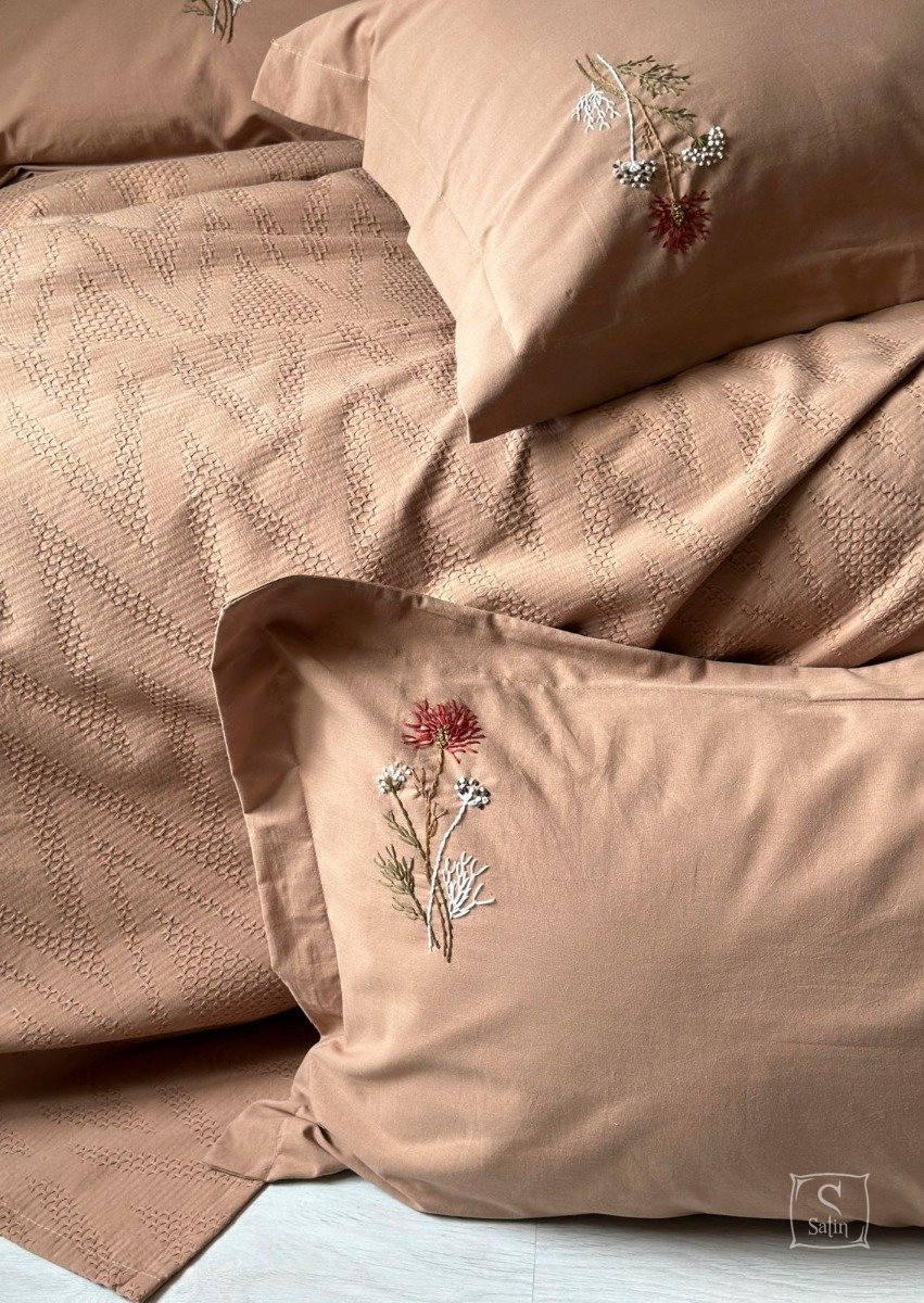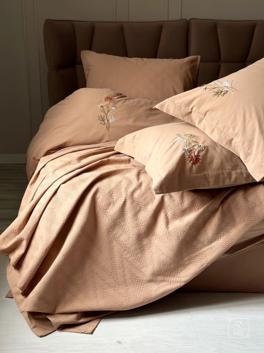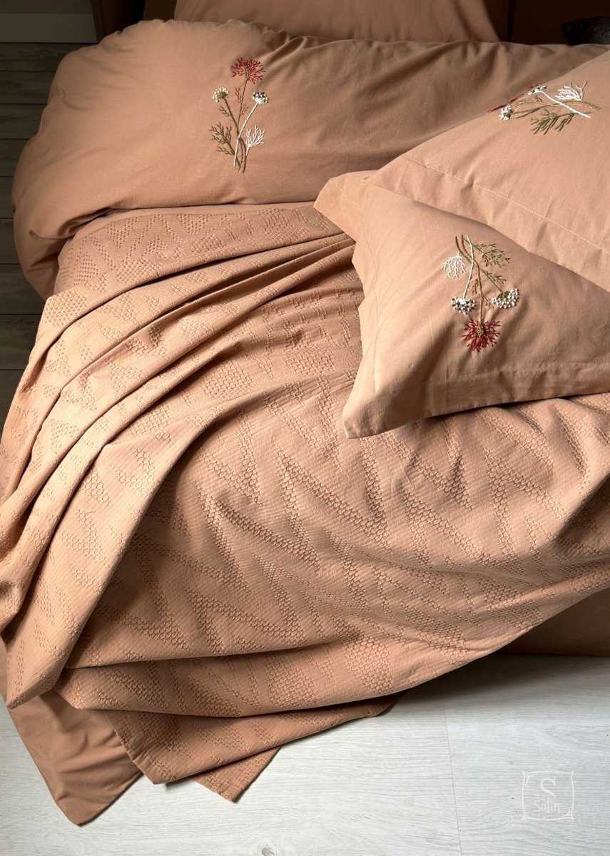 Комплект постельного белья с легким пике Saheser Noris mustardi изготовлен из 100% натурального хлопка, однотонный, горчичного цвета, декорирован вышивкой на пододеяльнике и наволочках, пике горчичного цвета с узором.
