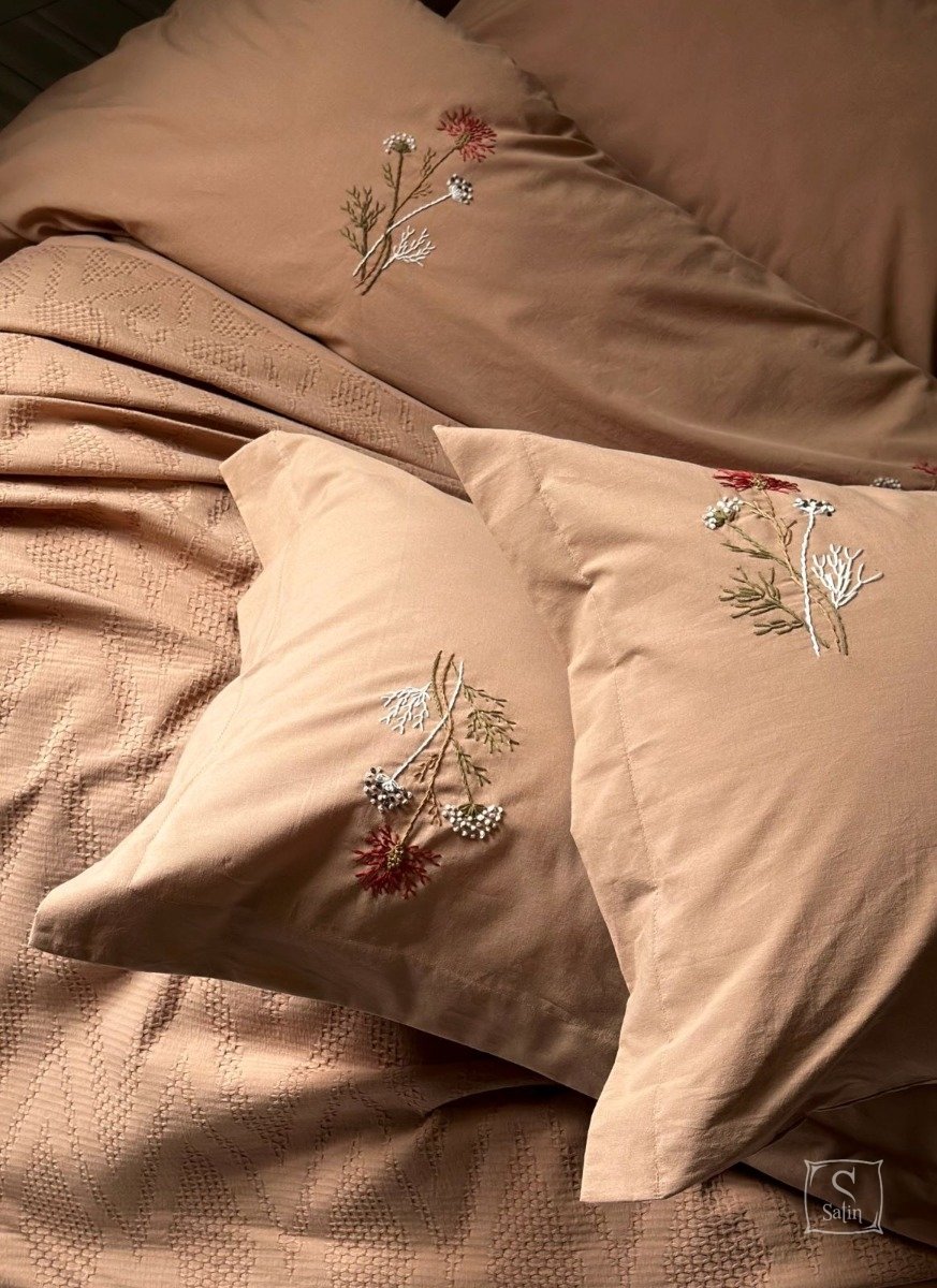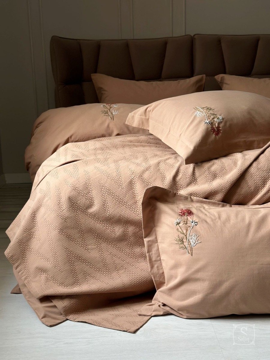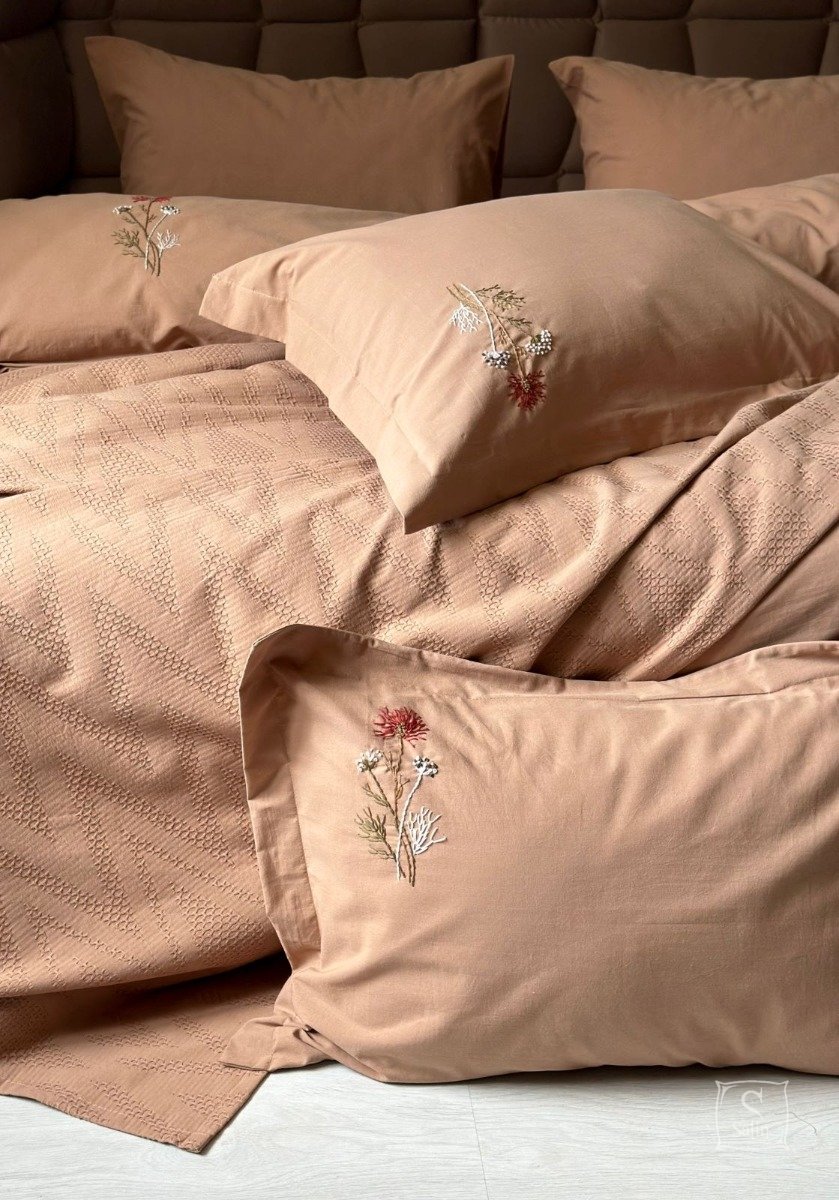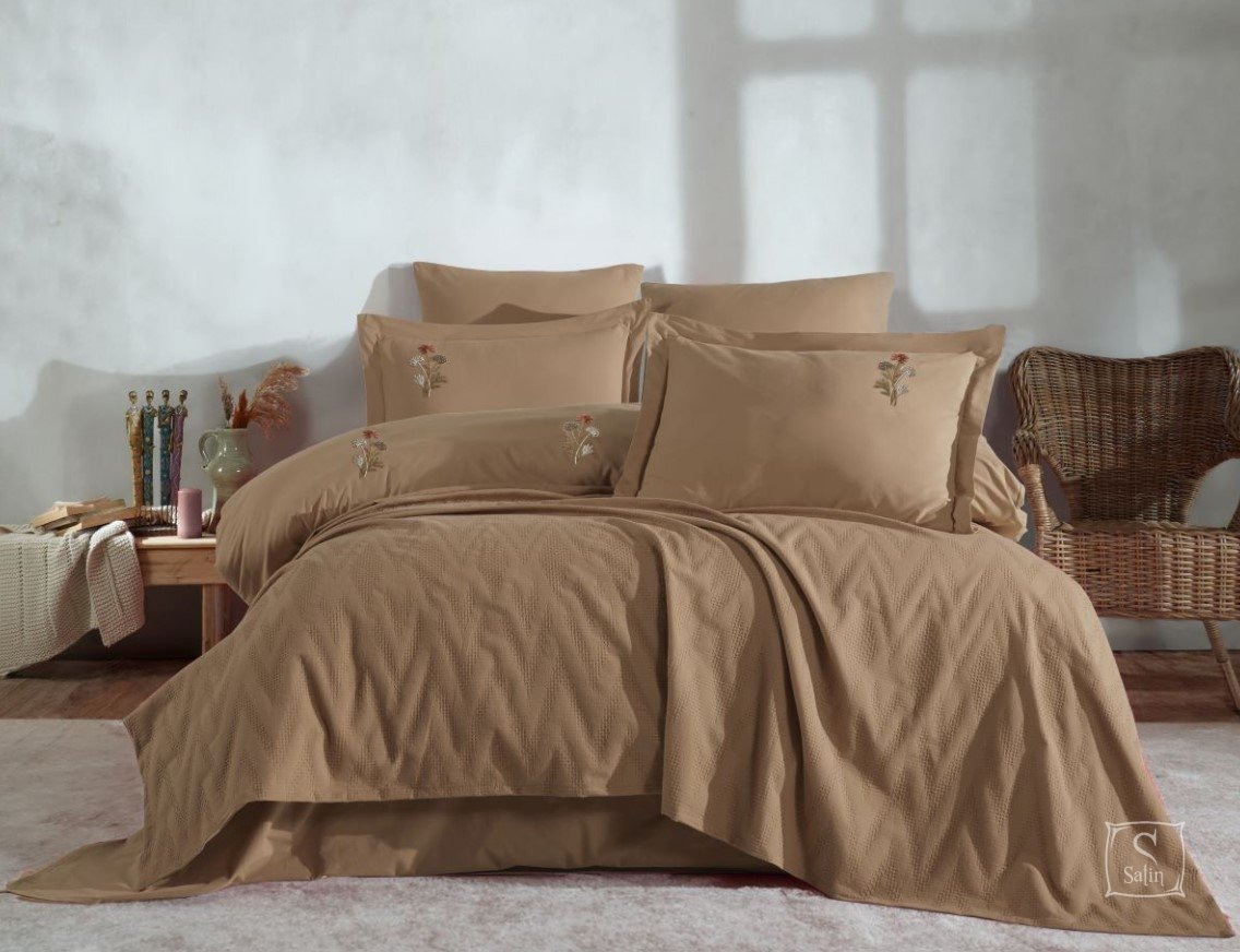 Комплект постельного белья с легким пике Saheser Noris mustardi изготовлен из 100% натурального хлопка, однотонный, горчичного цвета, декорирован вышивкой на пододеяльнике и наволочках, пике горчичного цвета с узором.
