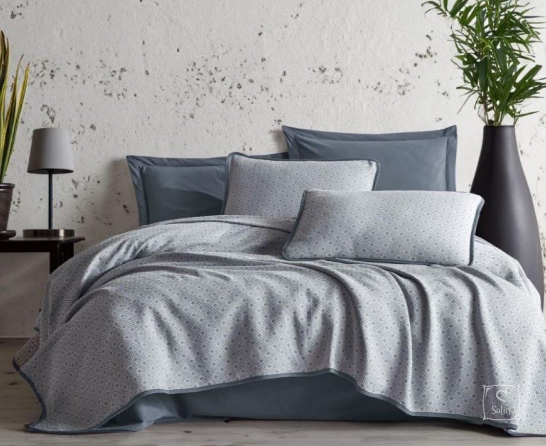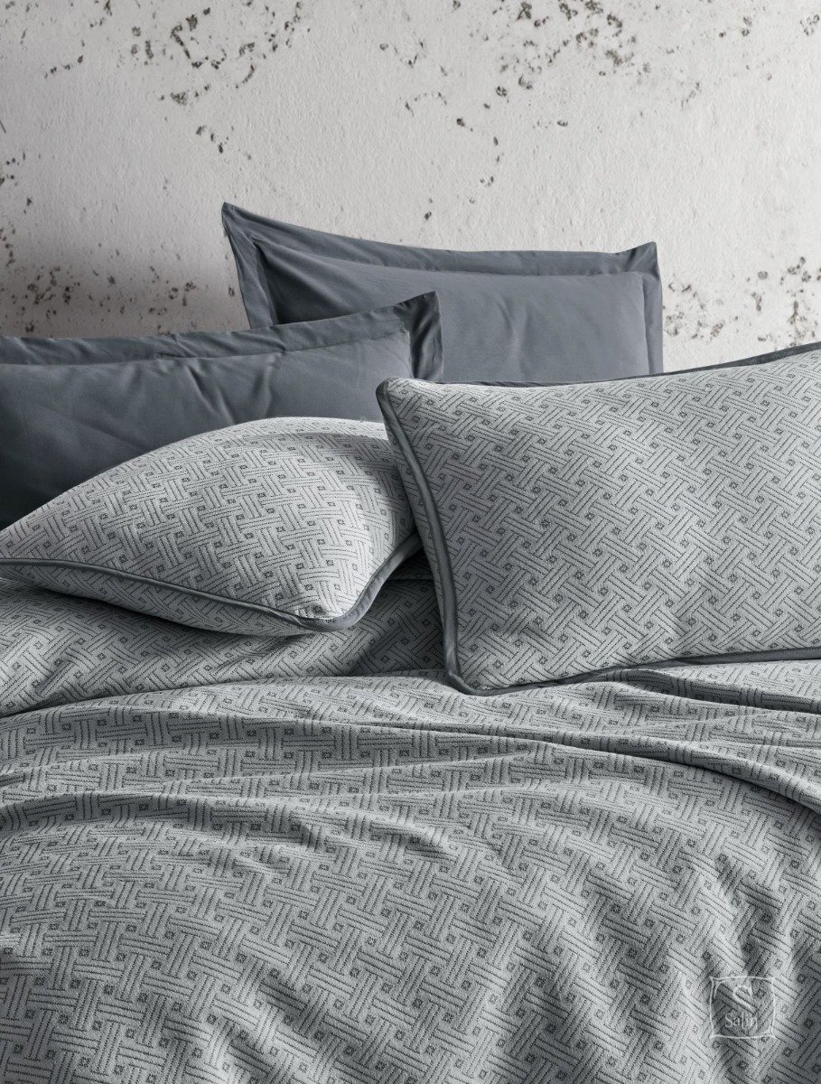 Комплект постельного белья с легким пике Saheser Silvano grey изготовлен из 100% натурального хлопка, однотонный серого цвета, пике и две наволочки в мелкий узор.