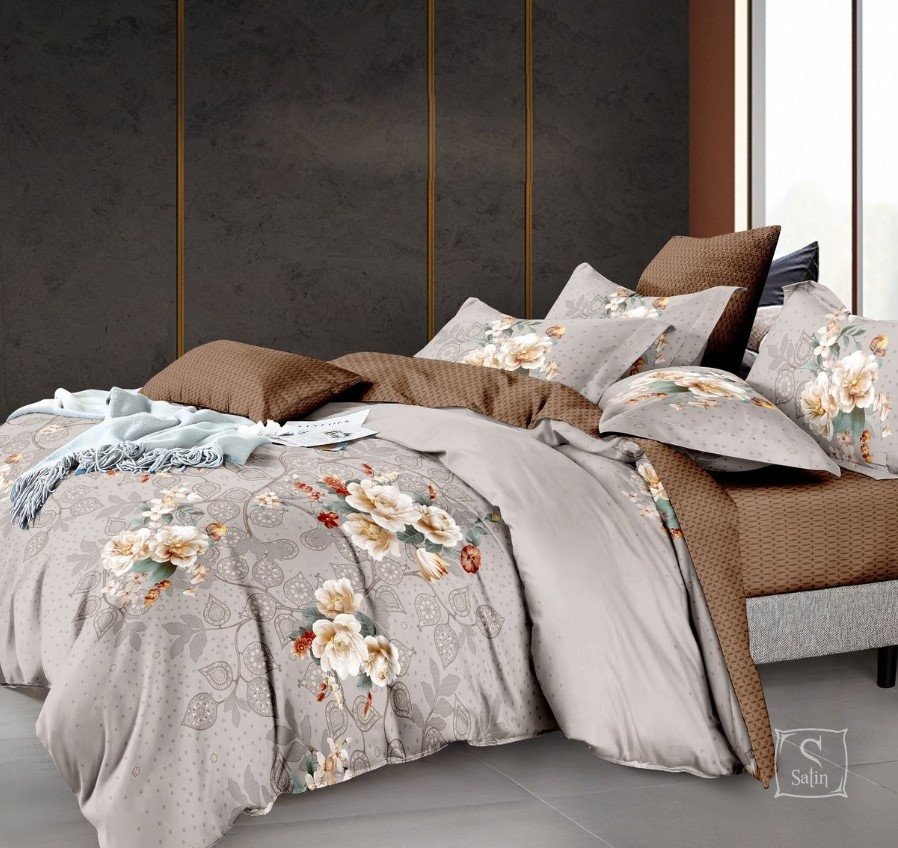 • Комплект постельного белья Sofia СР-368 Цветы выполнен в серо-коричневых тонах с принтом цветов.