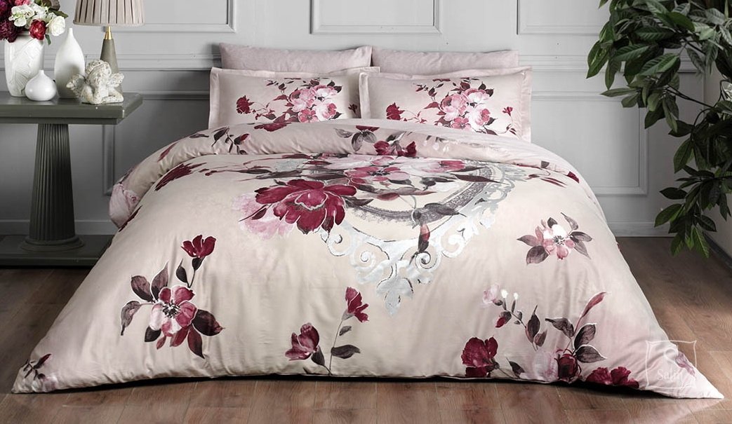 • Комплект  Vella Bordo  выполнен с цветочным узором в бело-бордовых тонах;