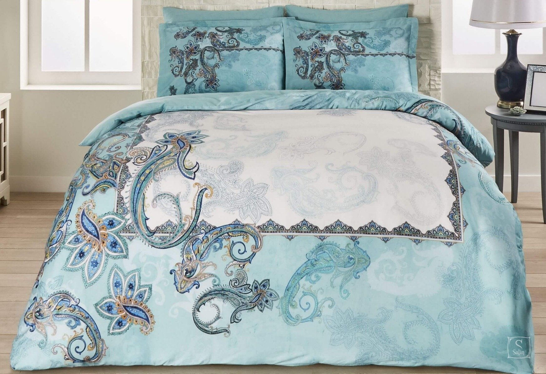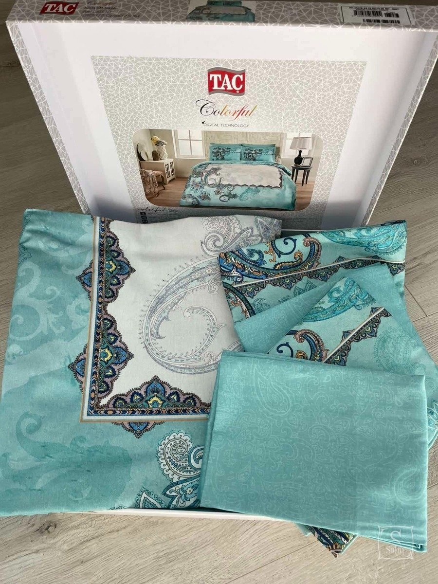 • Комплект Della Mint выполнен в бирюзовых тонах с принтом турецкие огурці (пейсли). Использованы ткани-компаньоны - простынь и 2 наволочки однотонные;