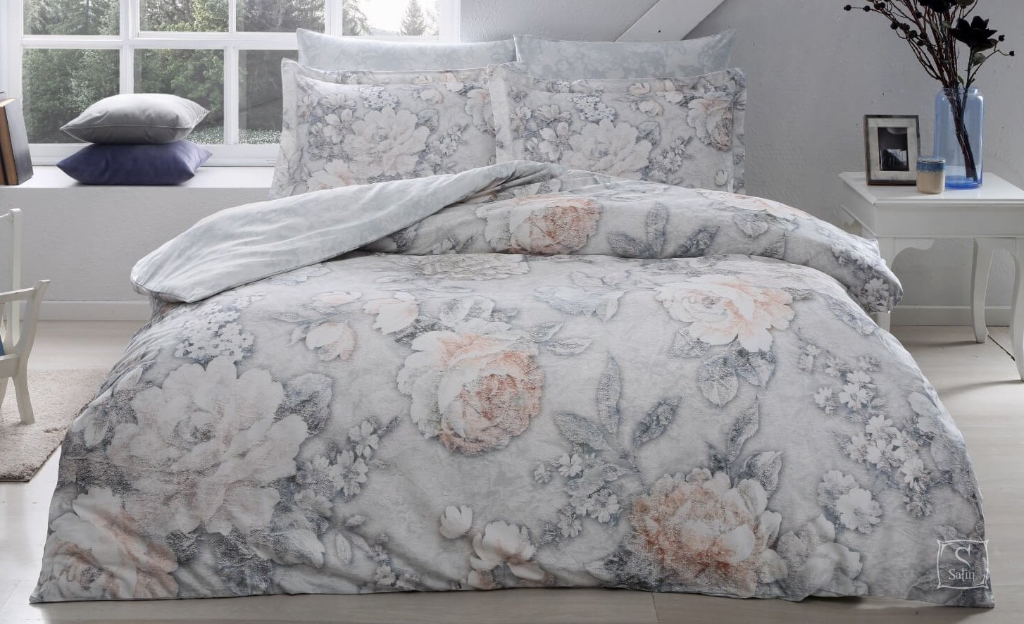• Комплект Seine Grey выполнен в серых тонах с цветочным принтом. Использованы ткани-компаньоны - простынь и 2 наволочки однотонные, без принта;