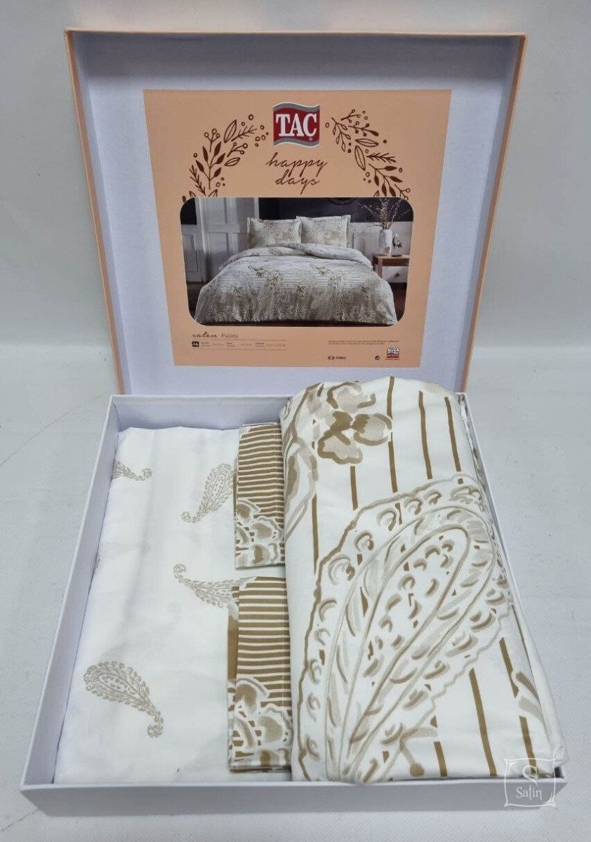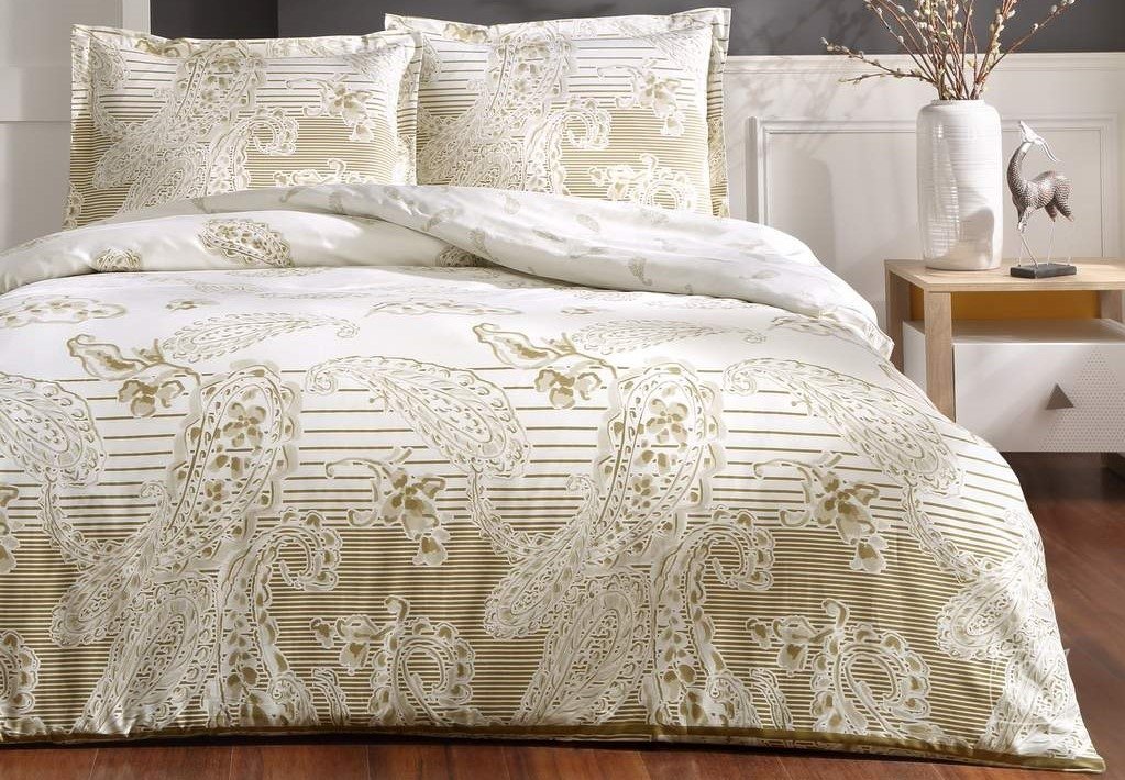 Комплект постельного белья Paisley Gold выполнен в бело-золотистых тонах с узором турецкие огурцы из сатина (100% хлопок).
