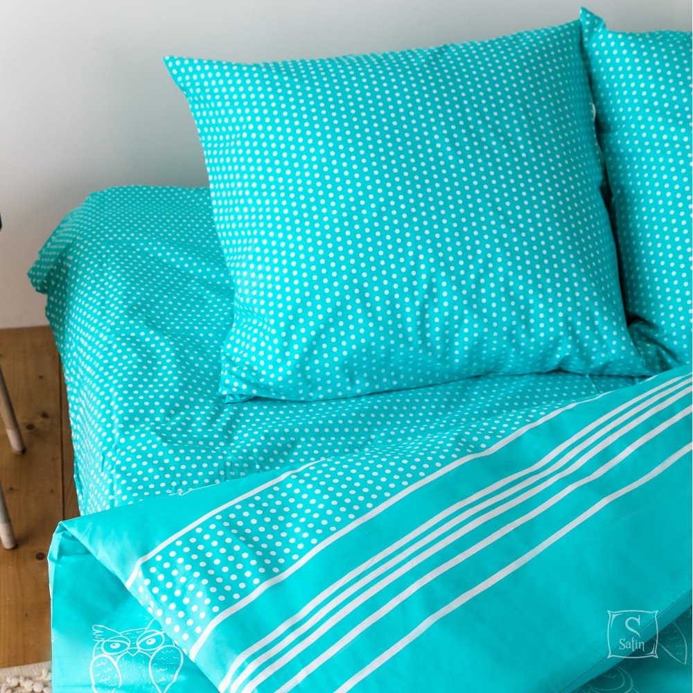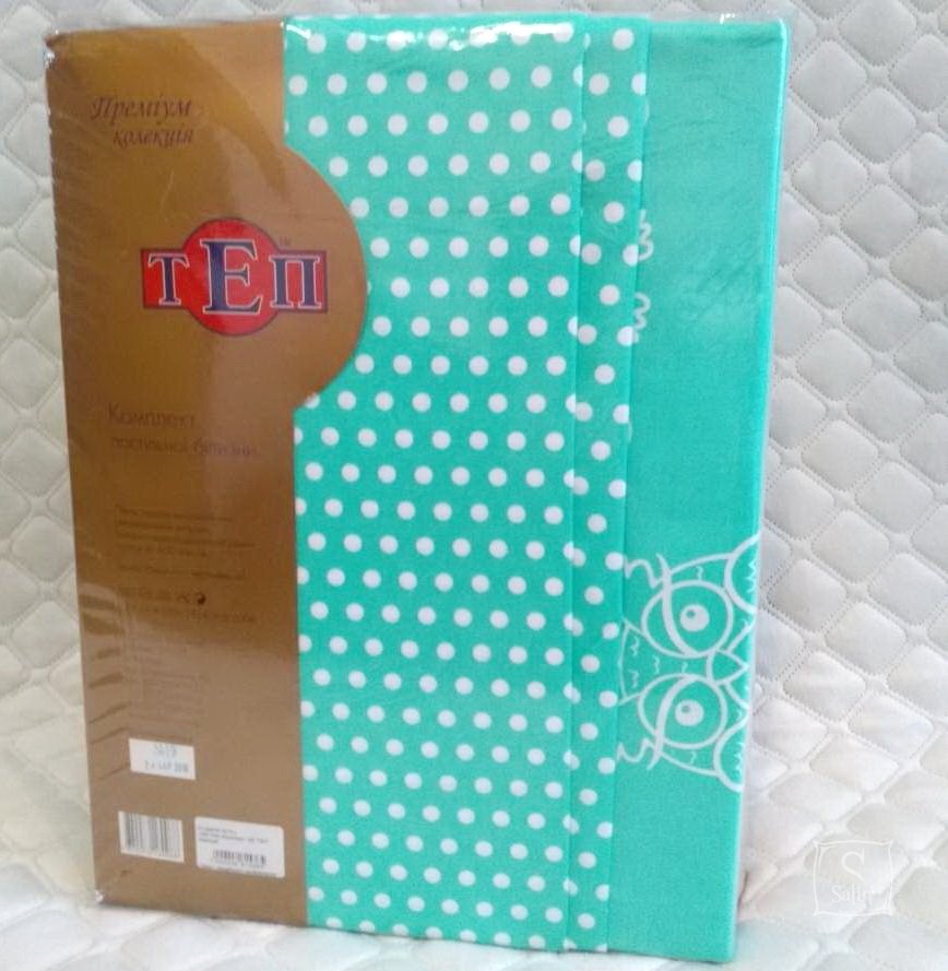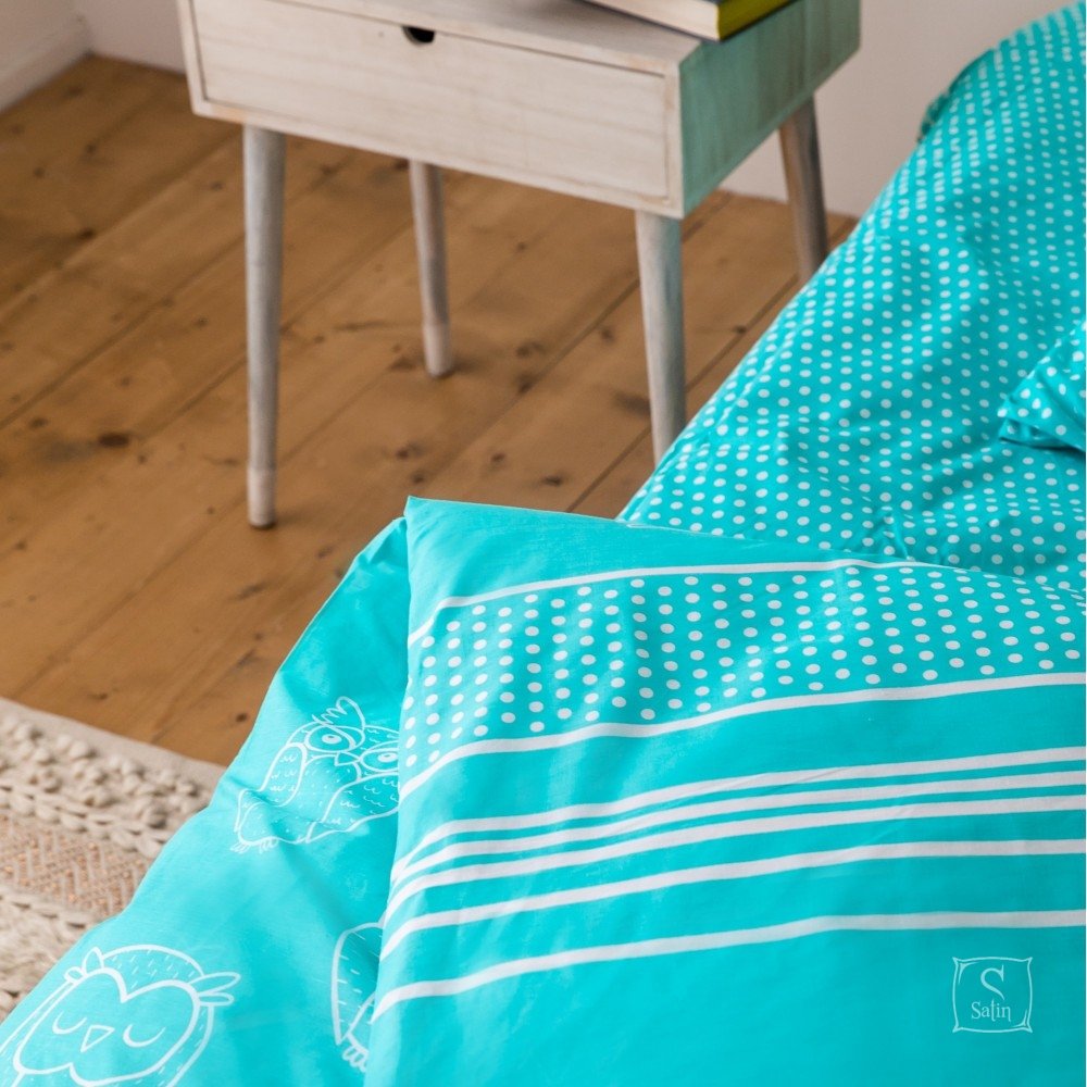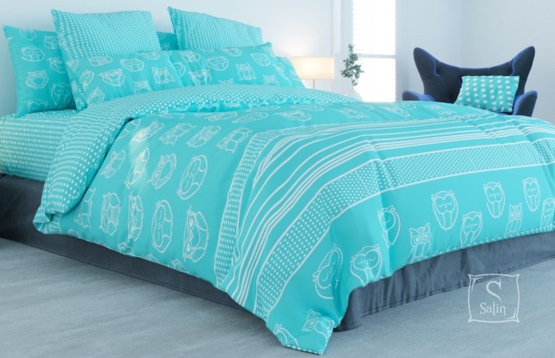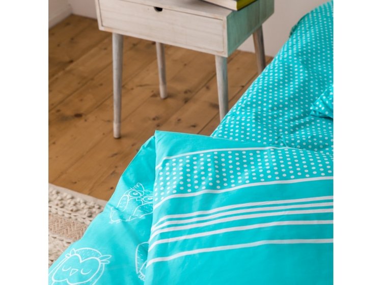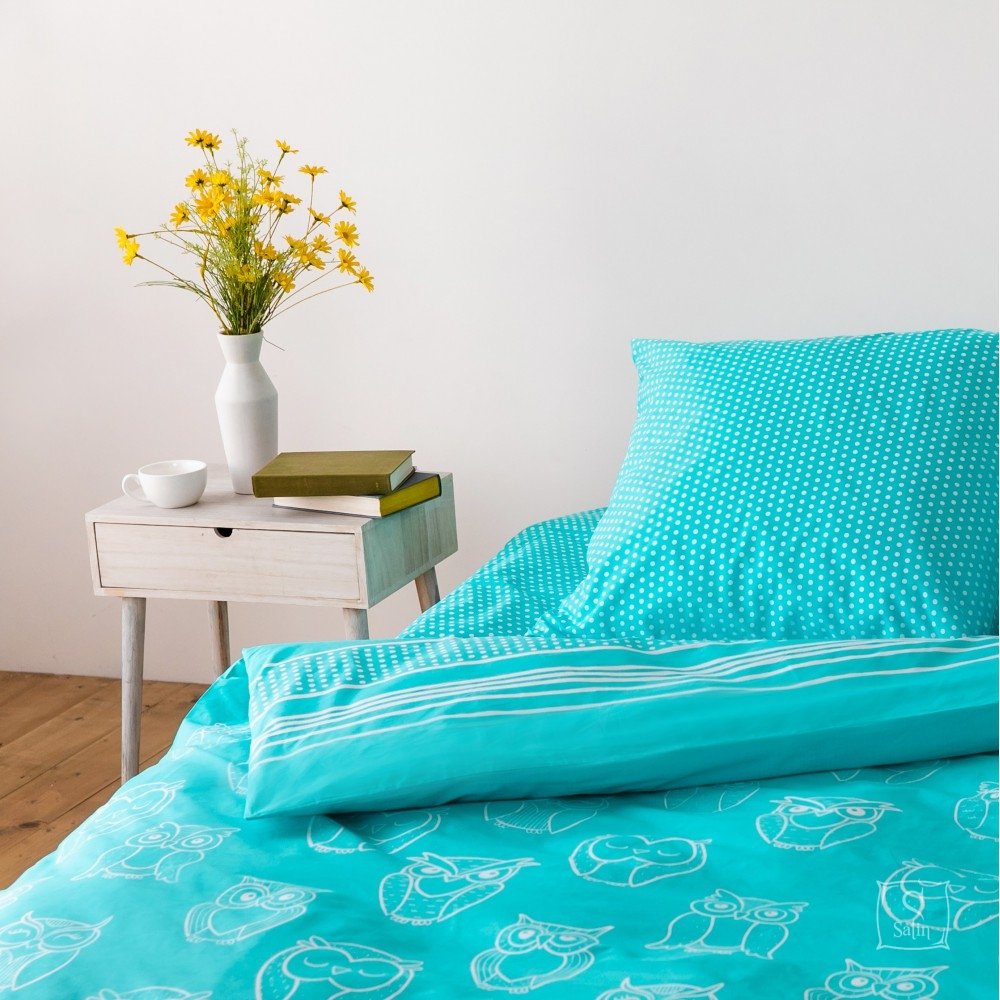 Комплект 299 OWL выполнен в бирюзовых тонах с принтом сов. Оригинальная расцветка ткани привнесет в спальную комнату уют и позитив.
