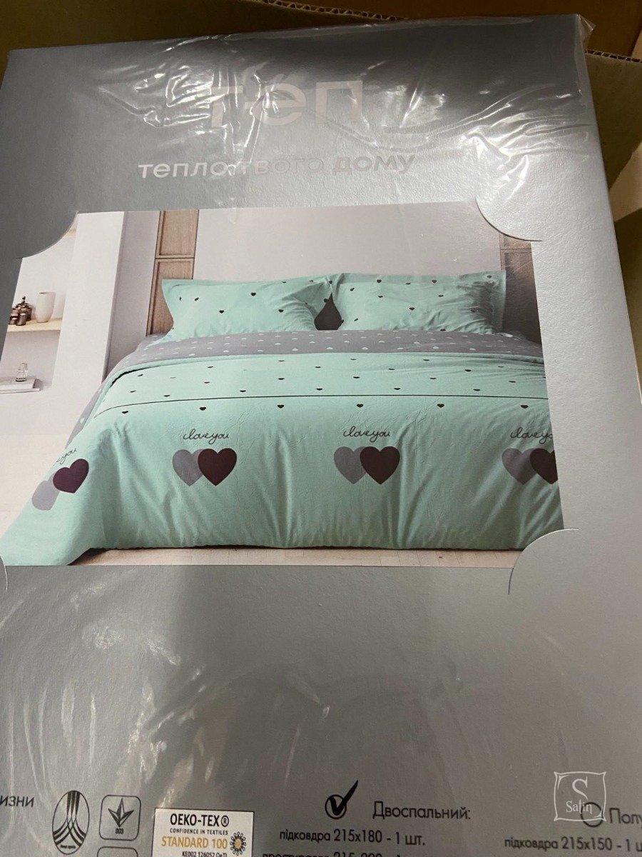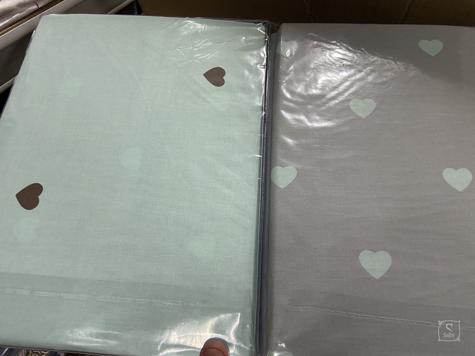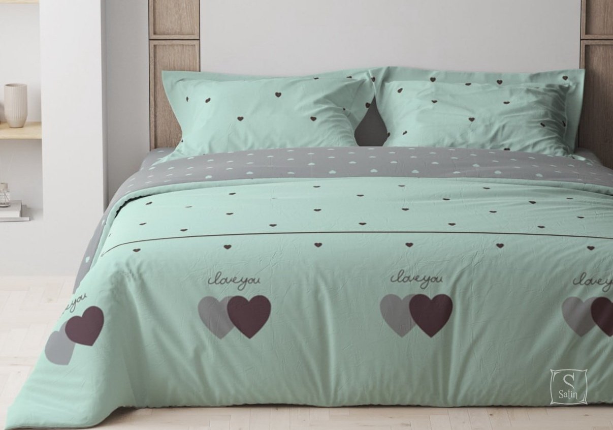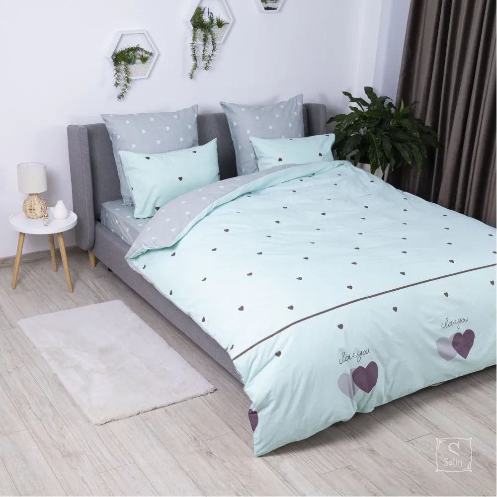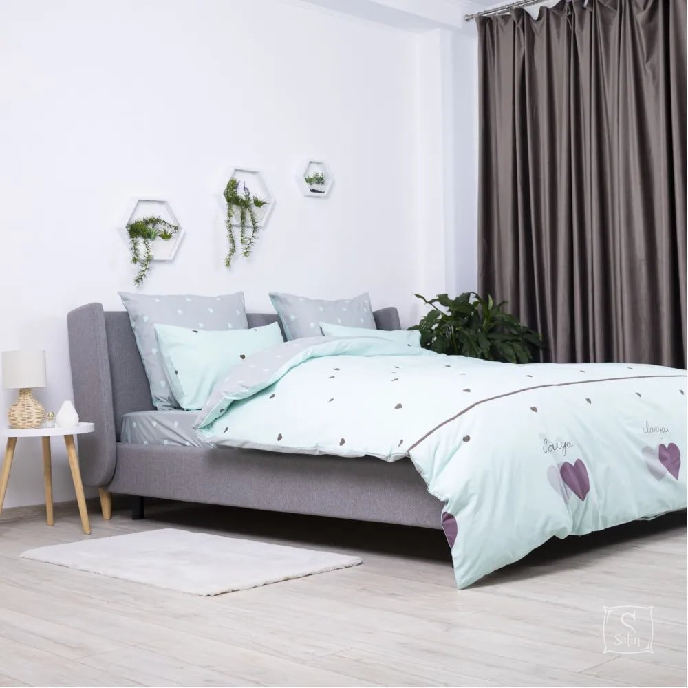 Комплект ТЕП Mint and Grey Hearts с рисунком сердечки на ментолово-сером фоне.