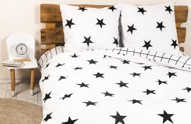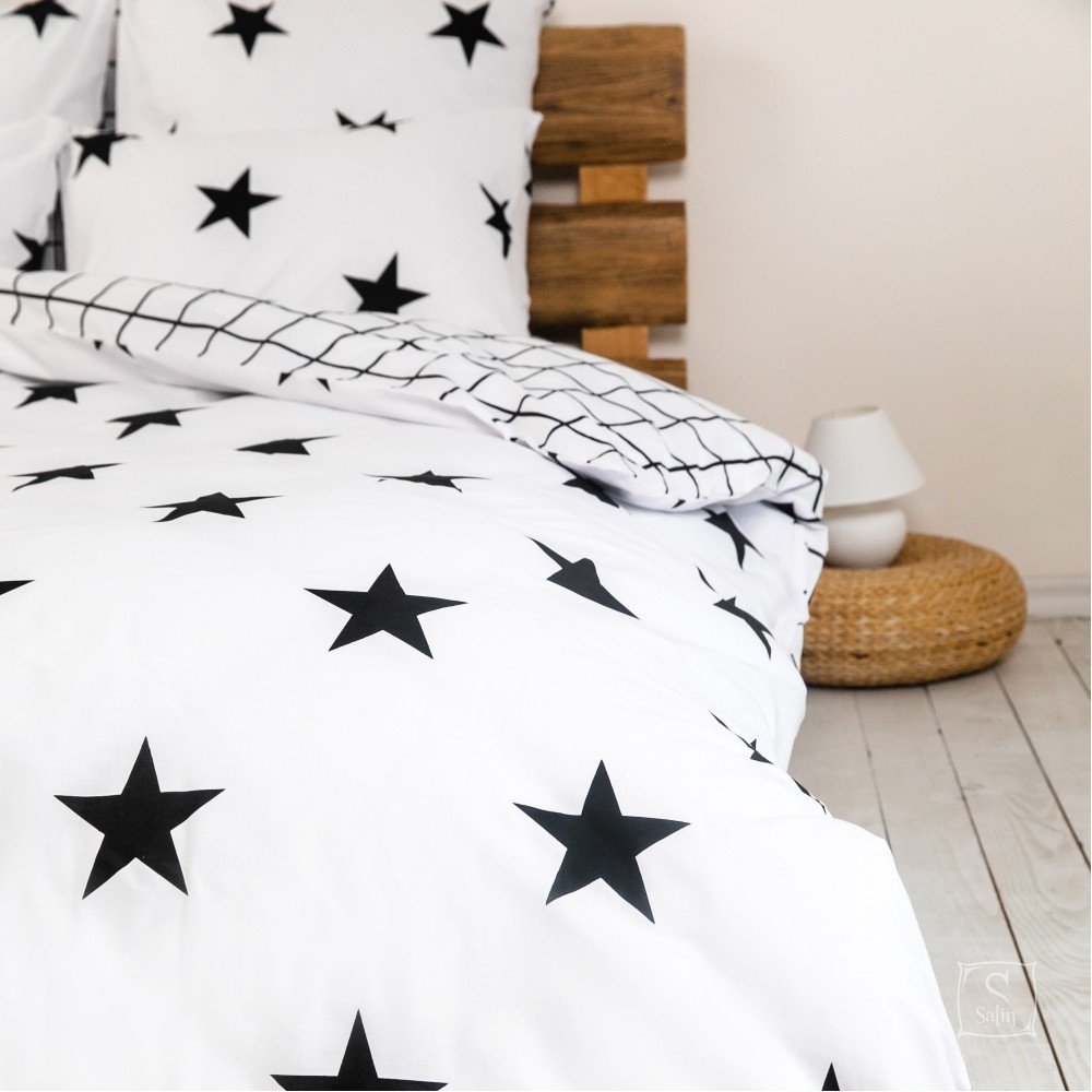 Комплект Soft dreams Morning Stars выполнен в чорно-белых тонах, преимущественно в белых с оригинальным узором клетка и звезды.