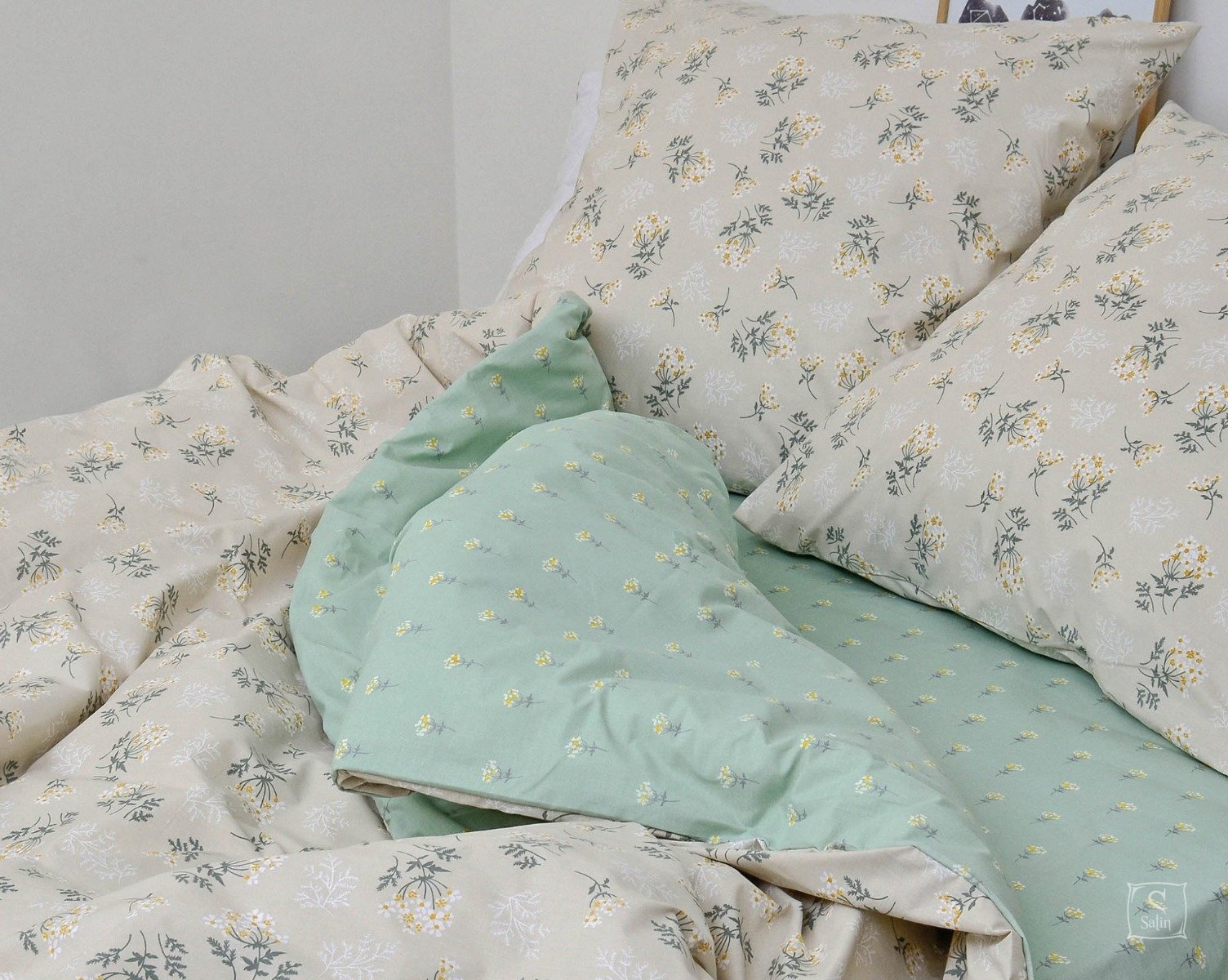 Постельное белье Viluta из ранфорса. Модель 21139 выполнена в кремово-зеленых тонах с цветочным принтом