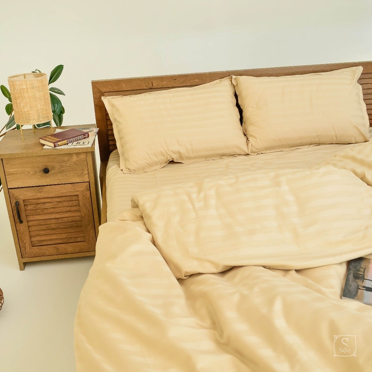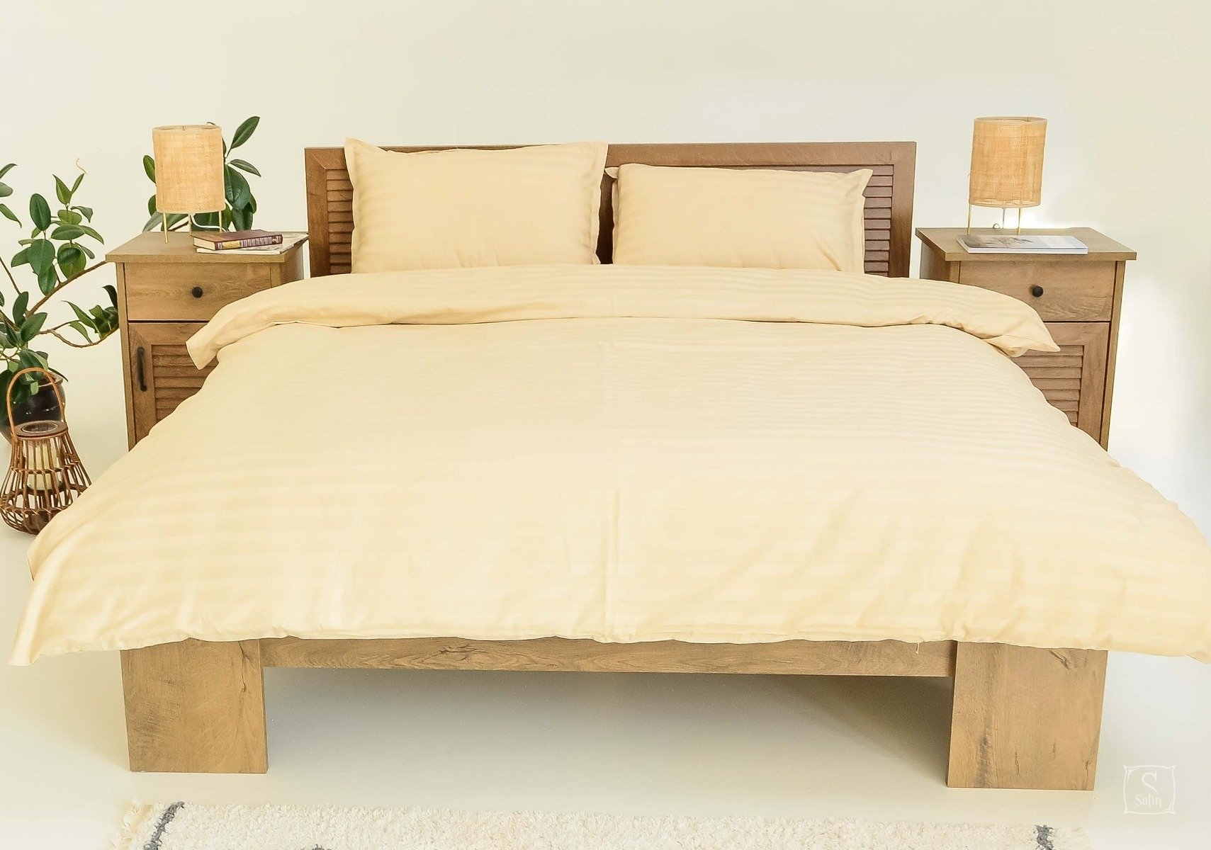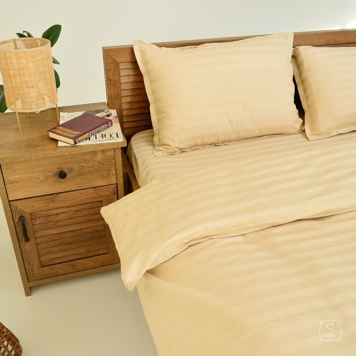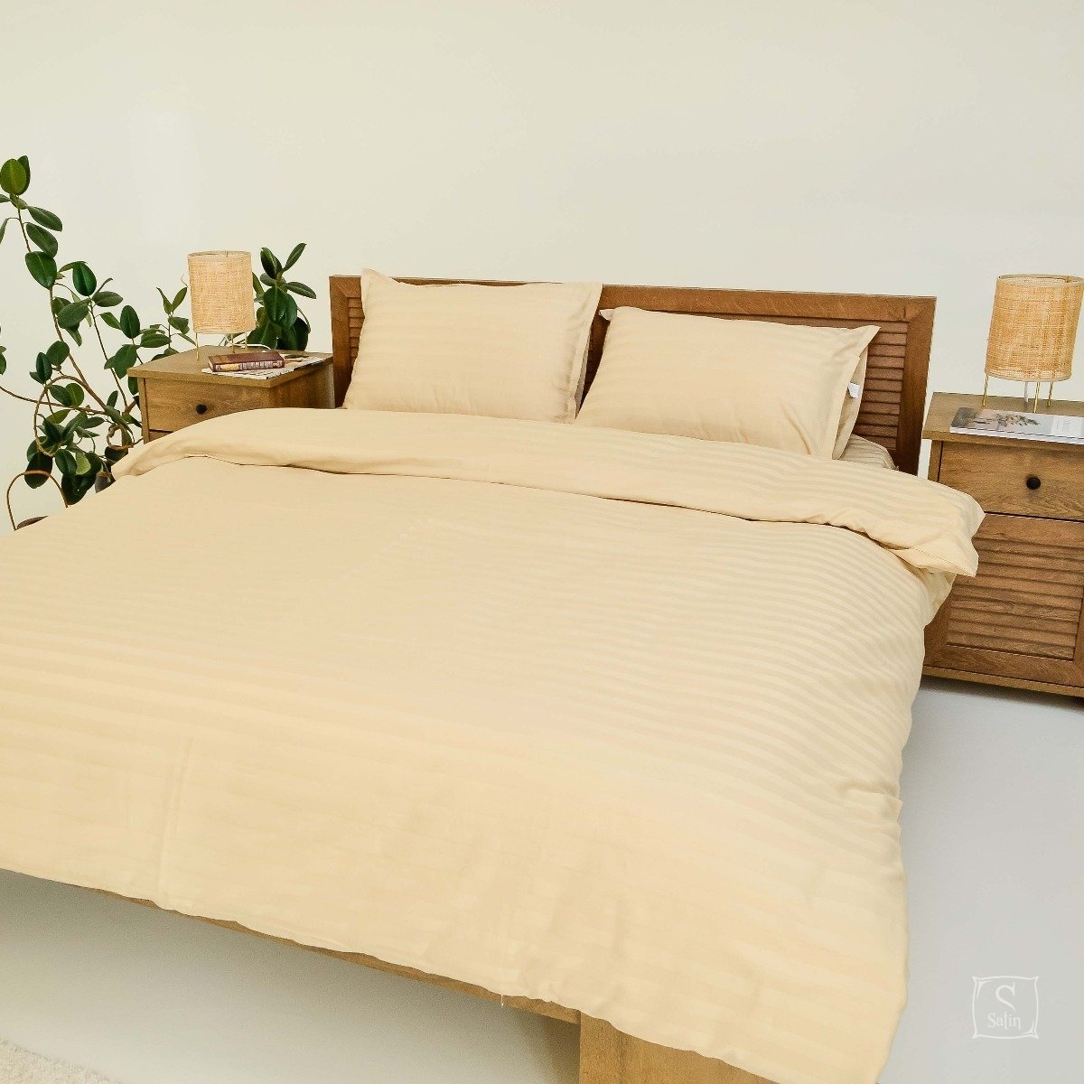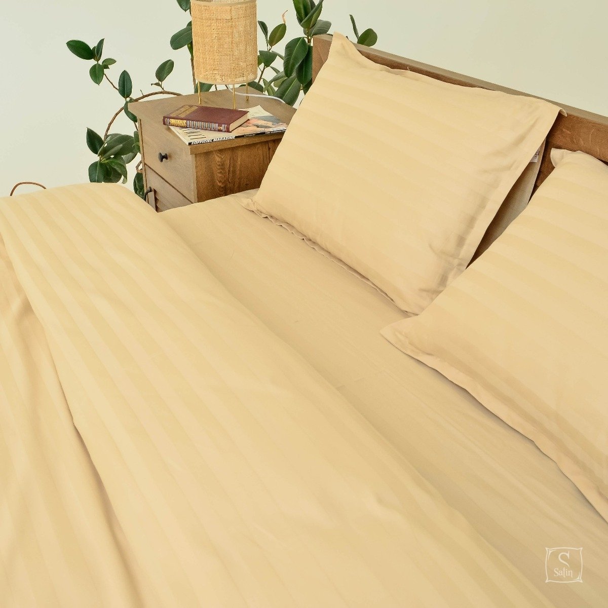 Комплект 72 выполнен в однотонном бежевом цвете со строгими жаккардовыми полосками. Относится к отельной серии постельного белья.
