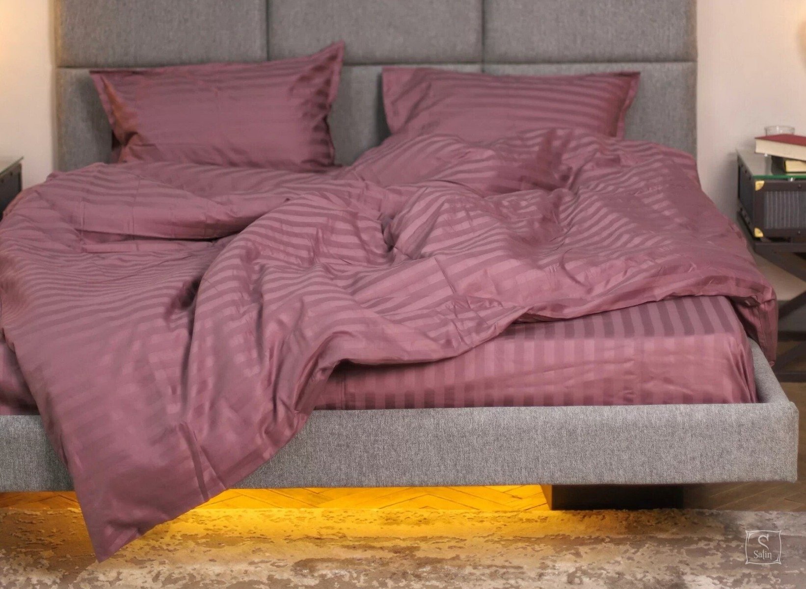 Комплект 73 выполнен в однотонном фиолетовом цвете со строгими жаккардовыми полосками. Относится к отельной серии постельного белья.
