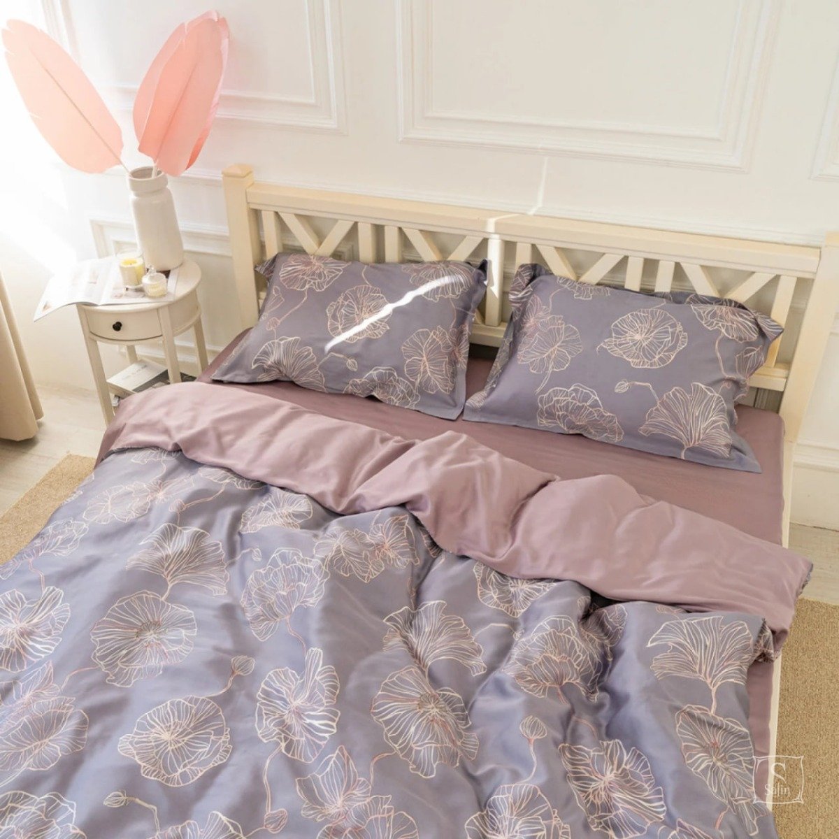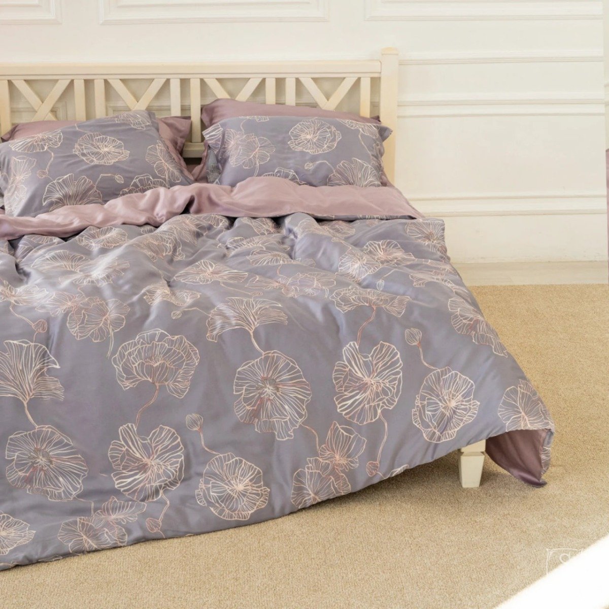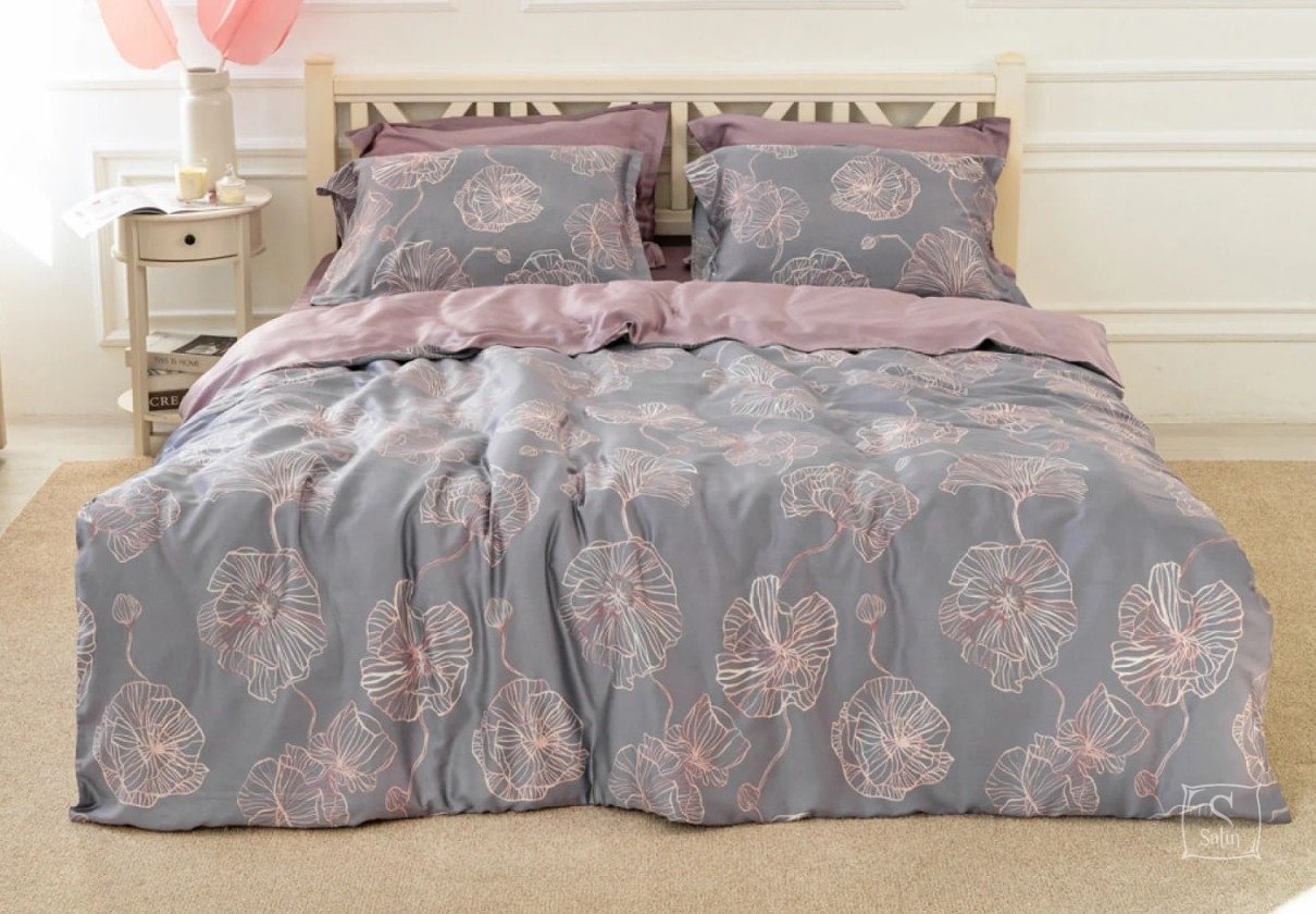 Комплект Тенсел Т-07 выполнен в серо-лиловых тонах с растительным узором.