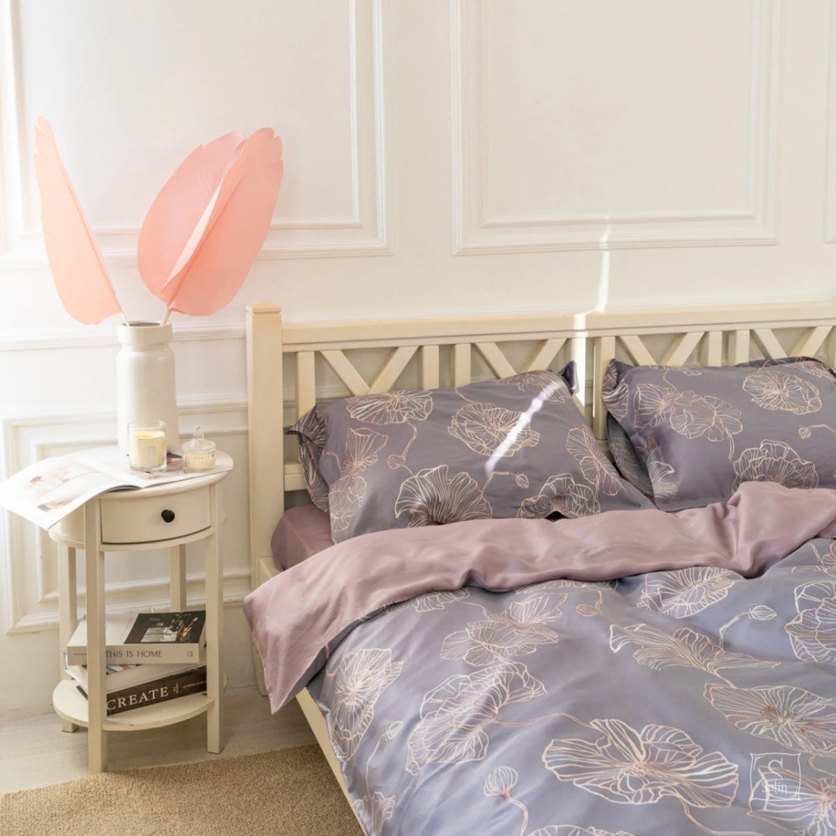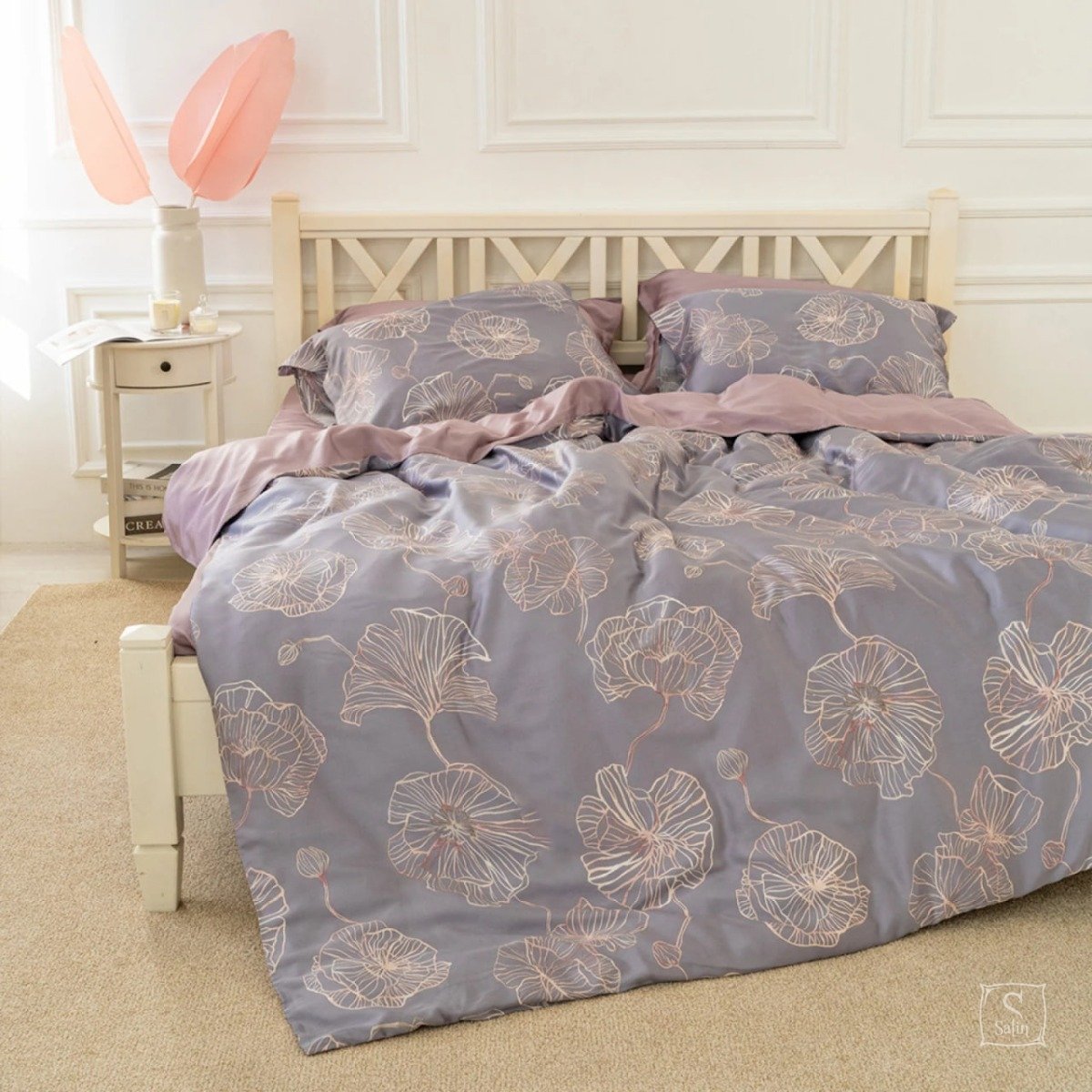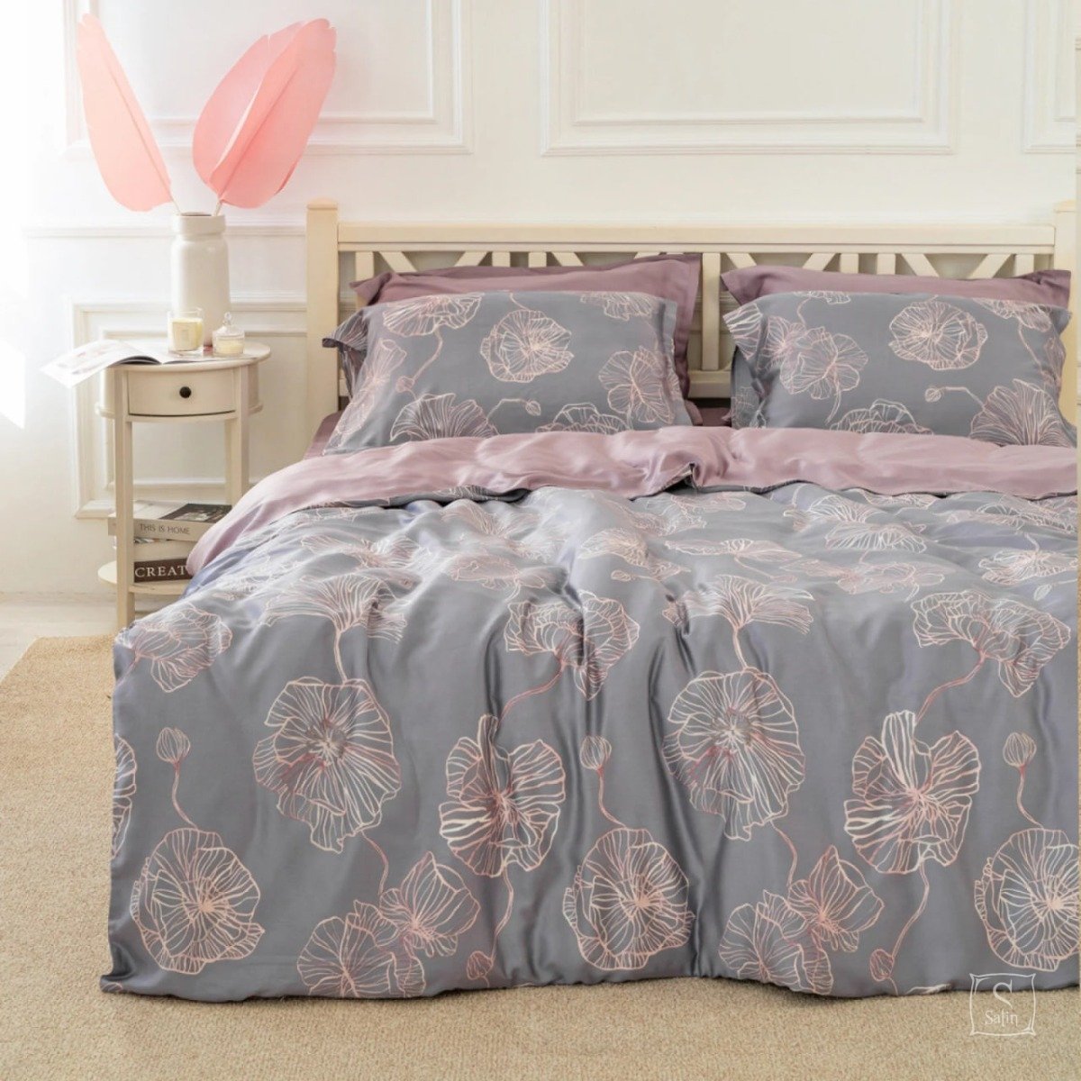Комплект Тенсел Т-07 выполнен в серо-лиловых тонах с растительным узором.