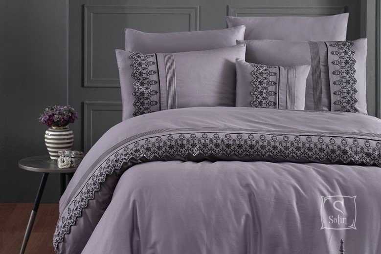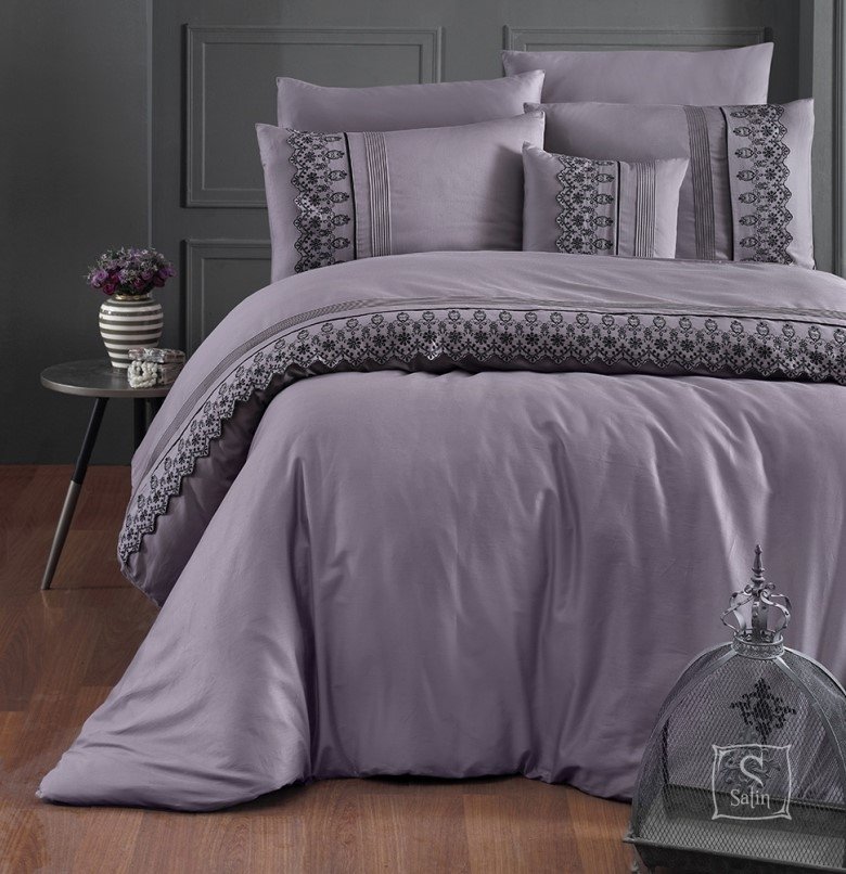 • Комплект Mona leylak выполнен в однотонном лиловом цвете, две наволочки и пододеяльник украшены кружевным кантом в цвет комплекта;