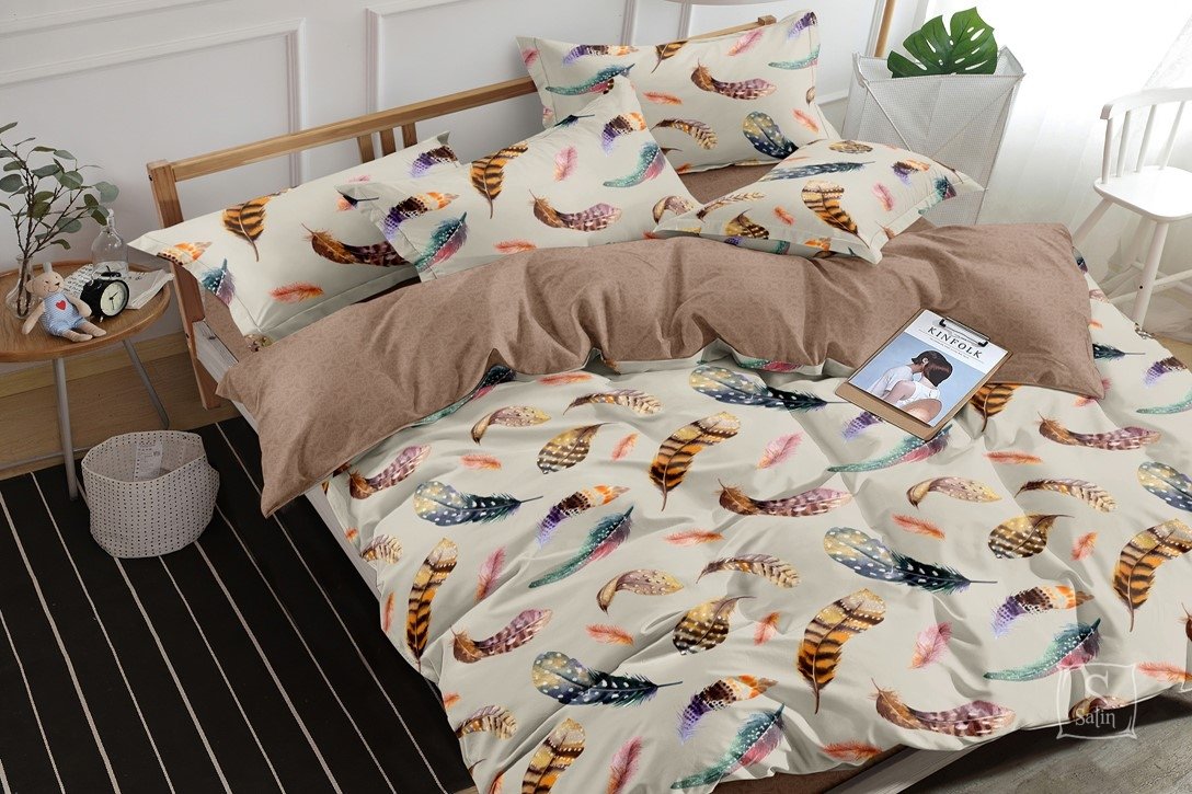• Комплект 20094 А/В выполнен в светлых тонах с узором разноцветные перья. Использованы ткани-компаньоны.