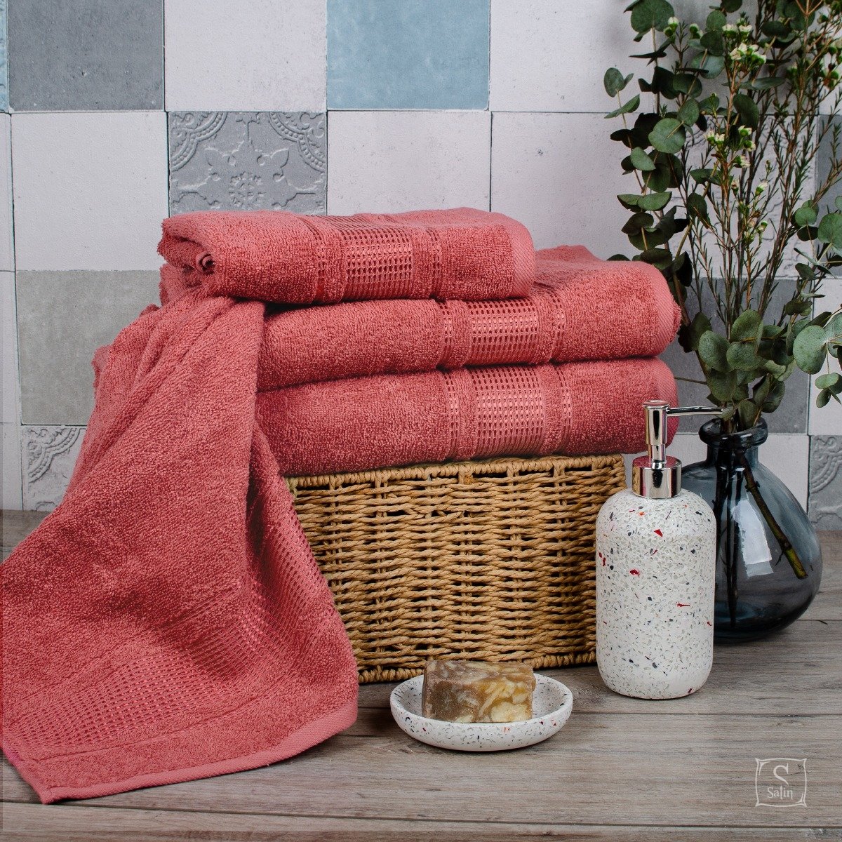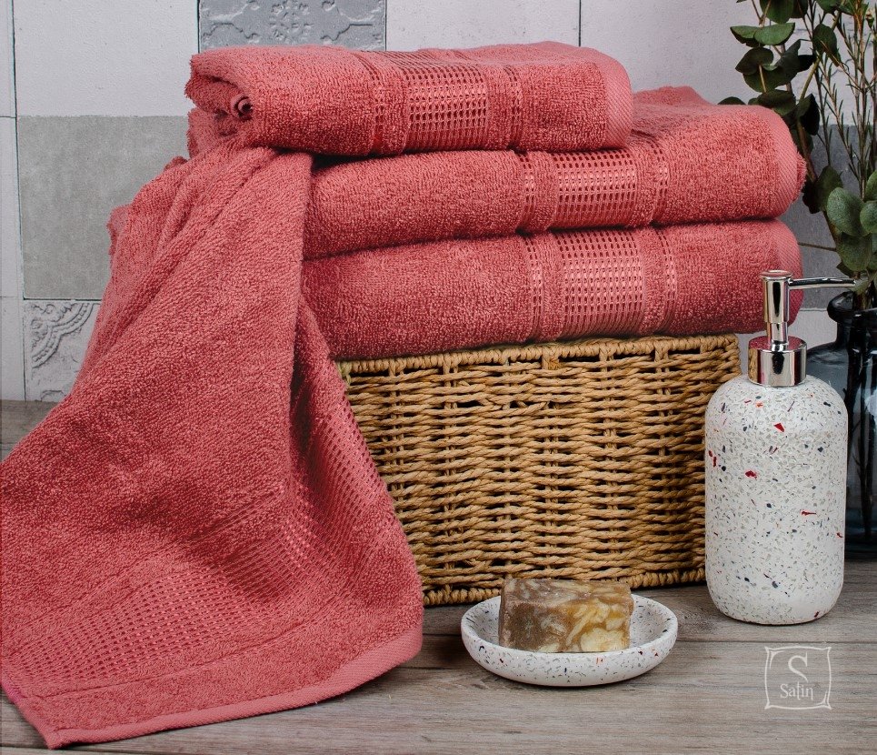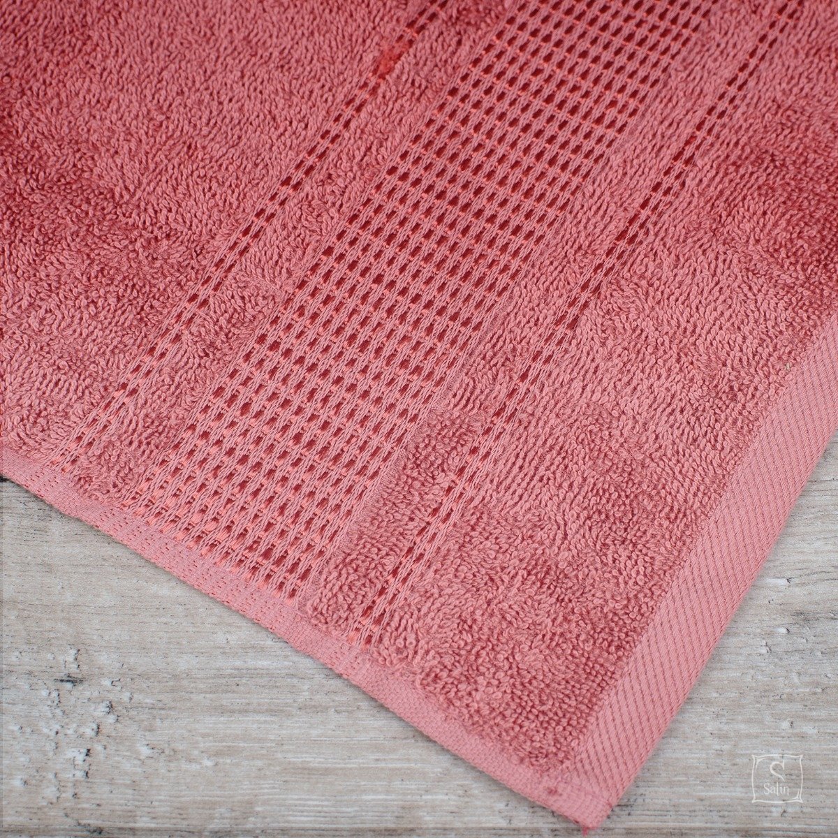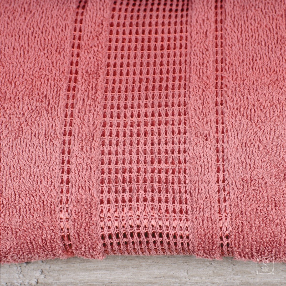 Полотенце махровое Аиша Royal кораллового цвета выполнено из 100% хлопка (махра), украшено красивым жаккардовым бордюром, плотность - 400 г/м².