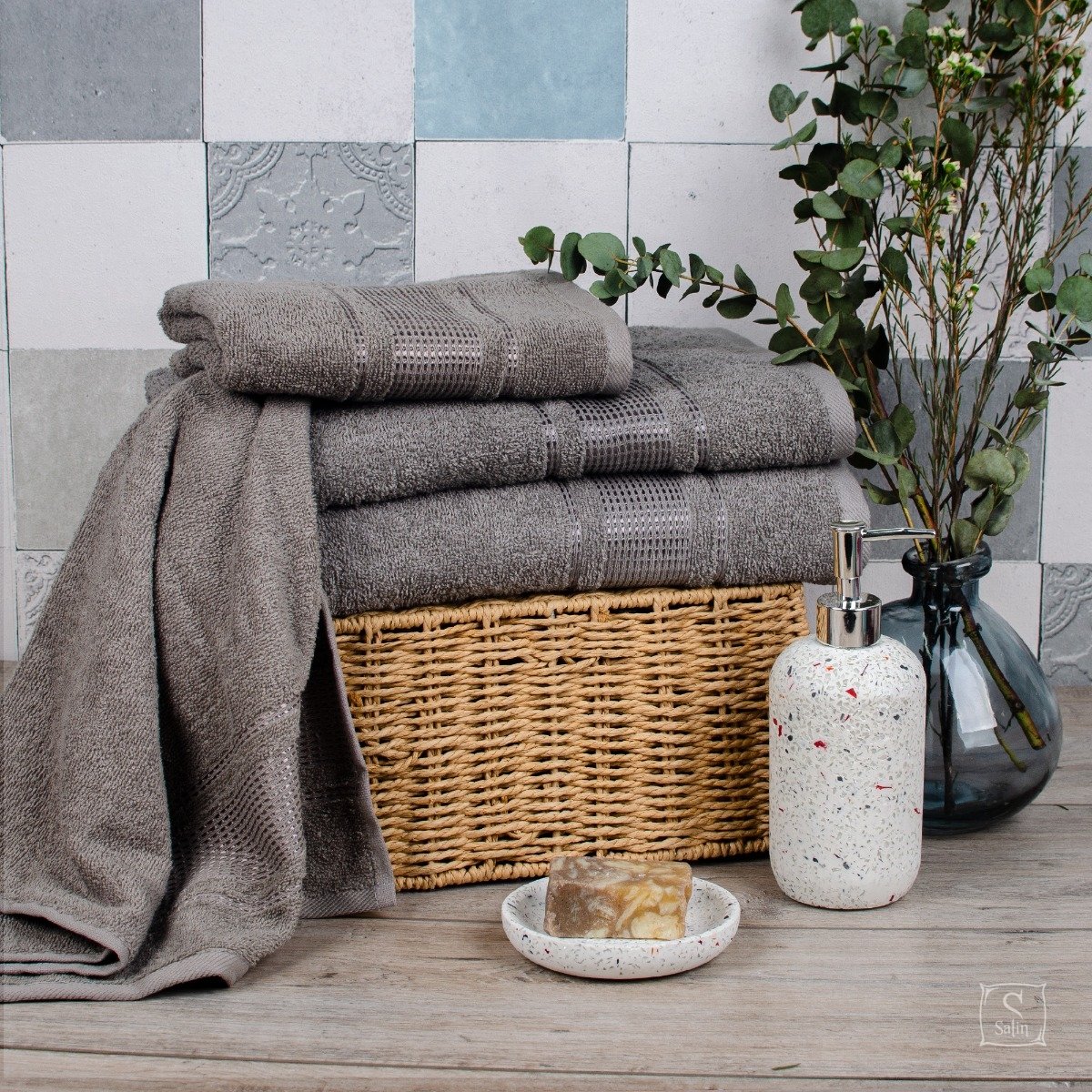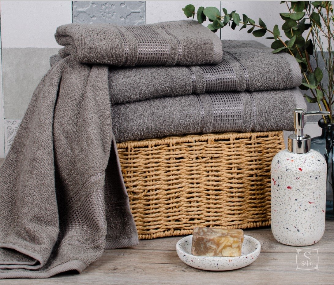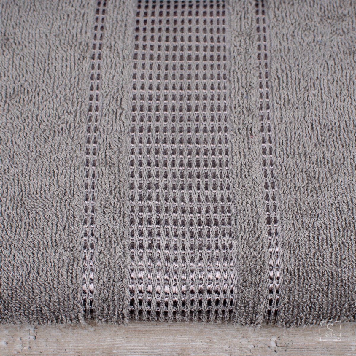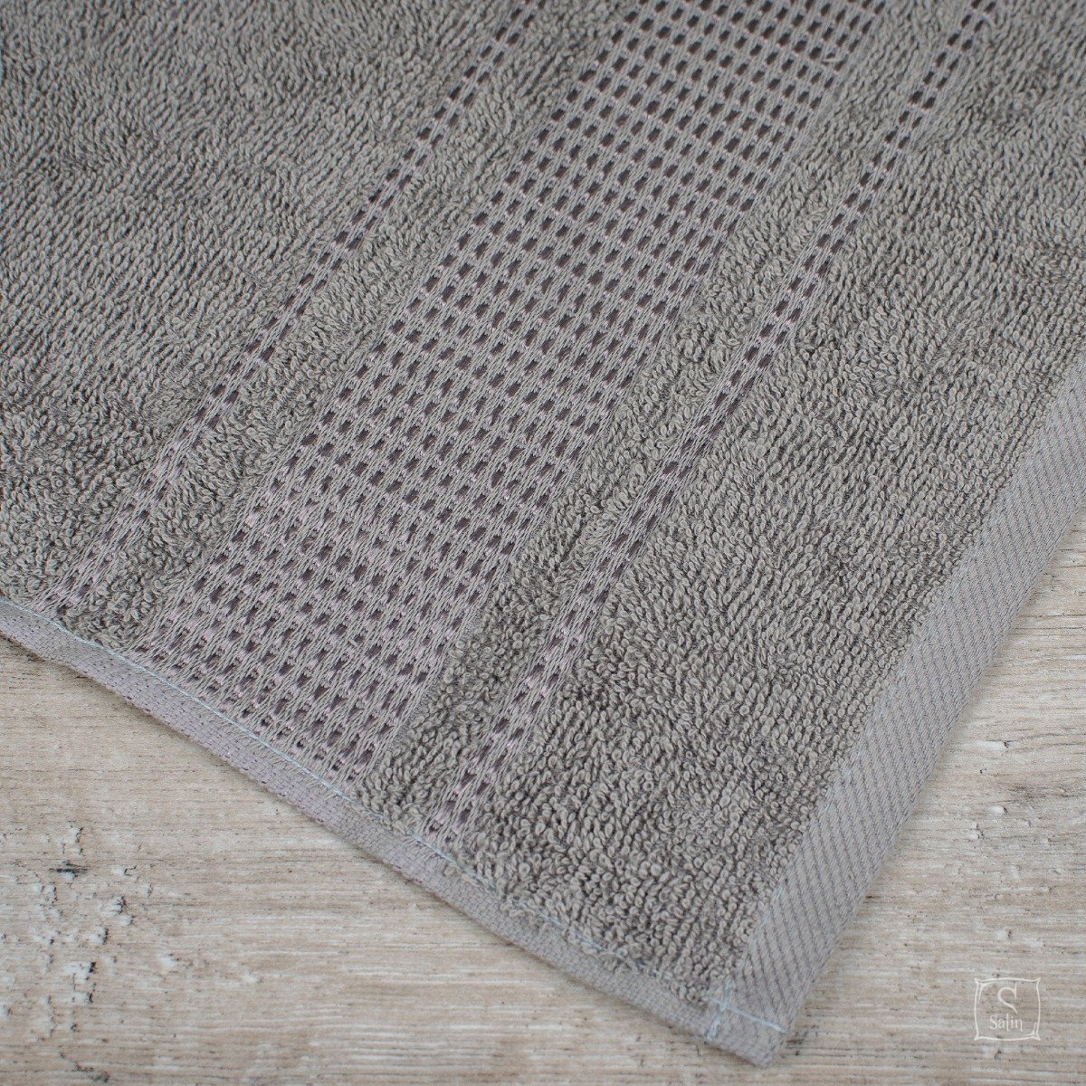 Полотенце махровое Аиша Royal серого цвета выполнено из 100% хлопка (махра), украшено красивым жаккардовым бордюром, плотность - 400 г/м².