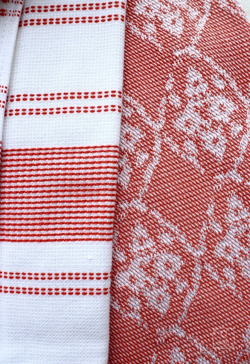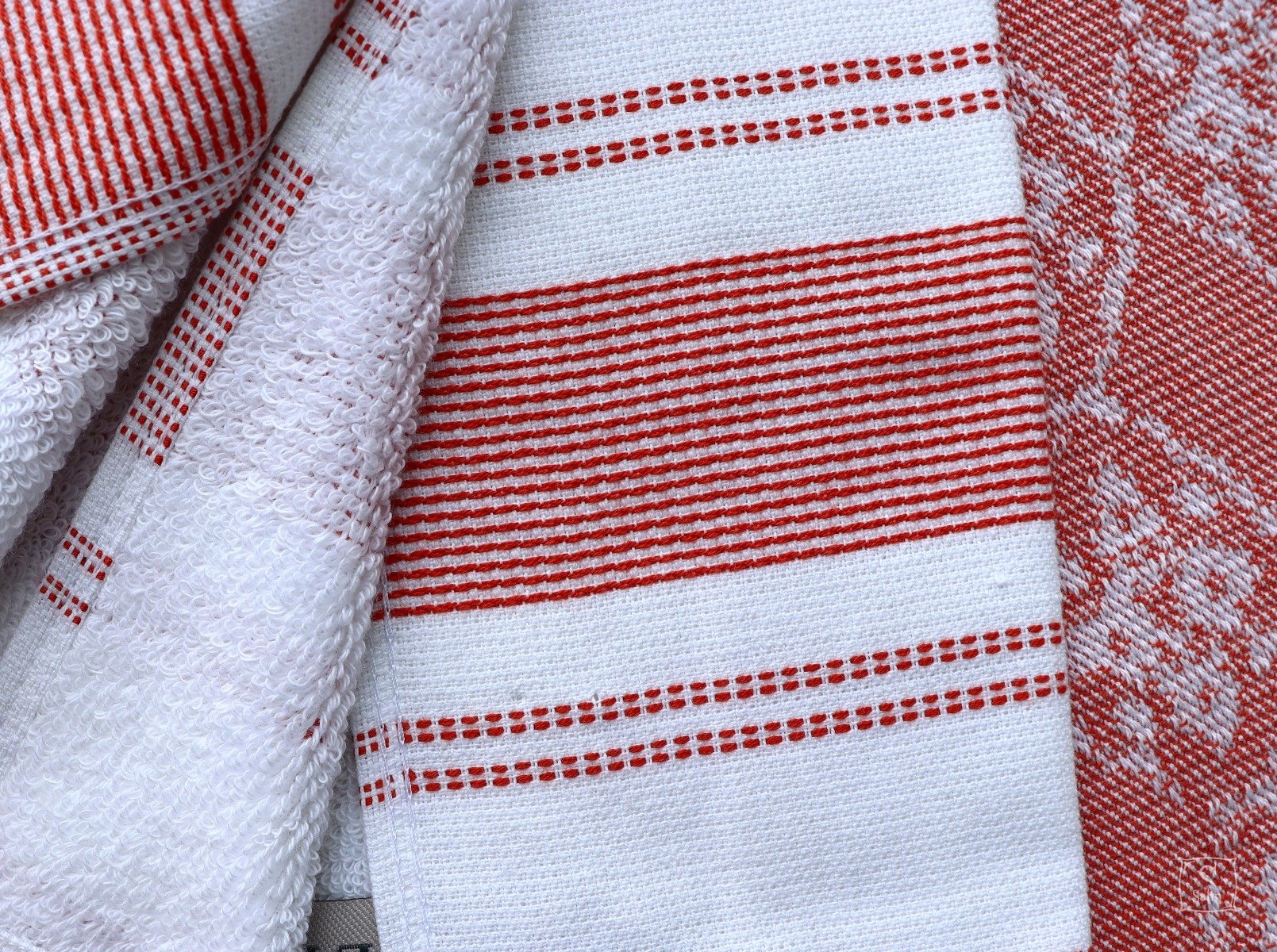 Полотенца выполнены в бело-красных тонах и имеют стильный оригинальный дизайн, подходящий под любой интерьер. Практичные в эксплуатации, хорошо выдерживают частые стирки, надолго сохраняют первоначальный цвет и вид.