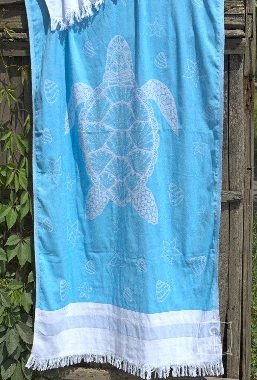 Пляжное полотенце Barine Pestemal Turtle Mavi выполнено из 100% хлопка. Красивое полотенце украшено узором черепаха и бахромой.
