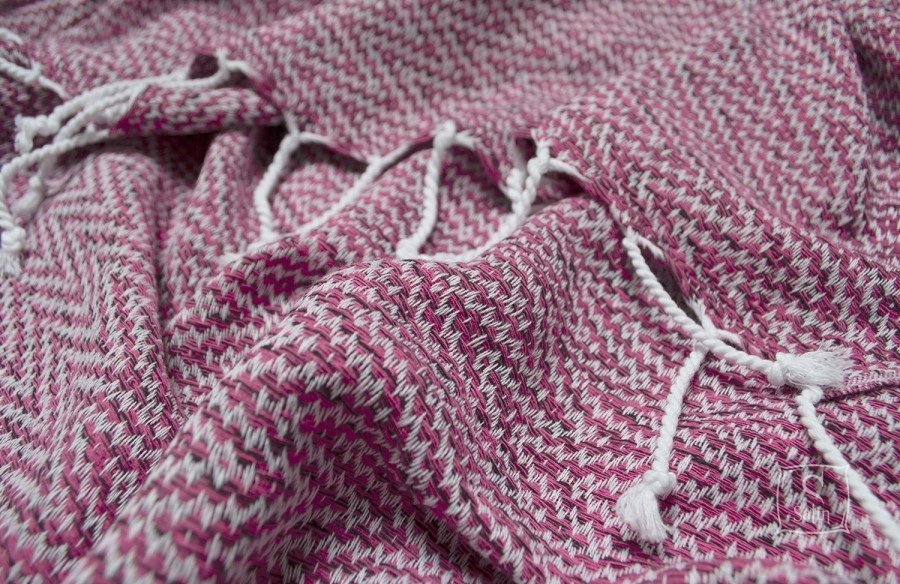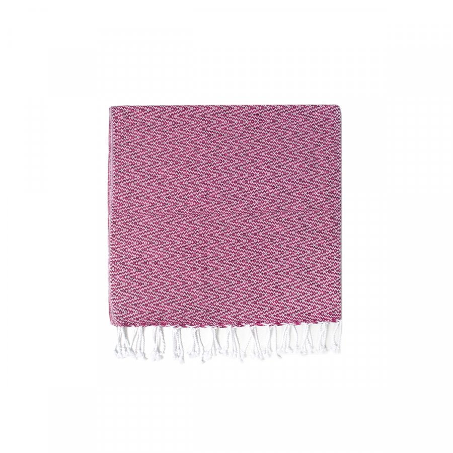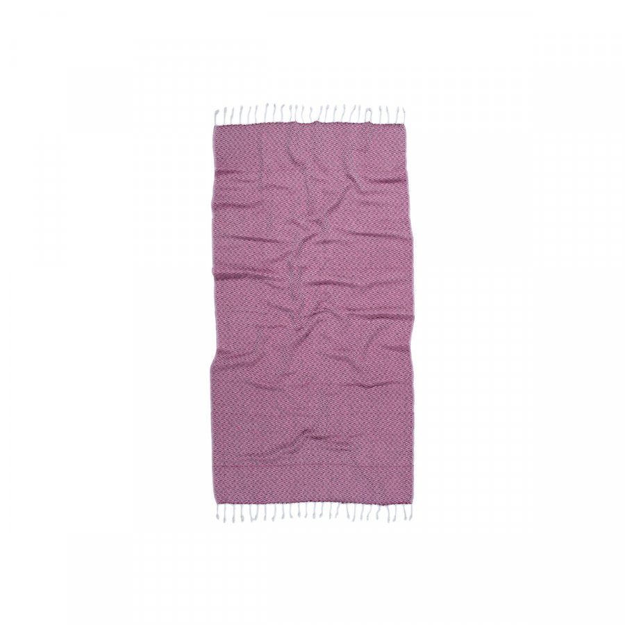 Пляжное полотенце Irya Ilgin pembe из 100% хлопка выполнено в розовых тонах с узором геометрия, украшено бахромой.