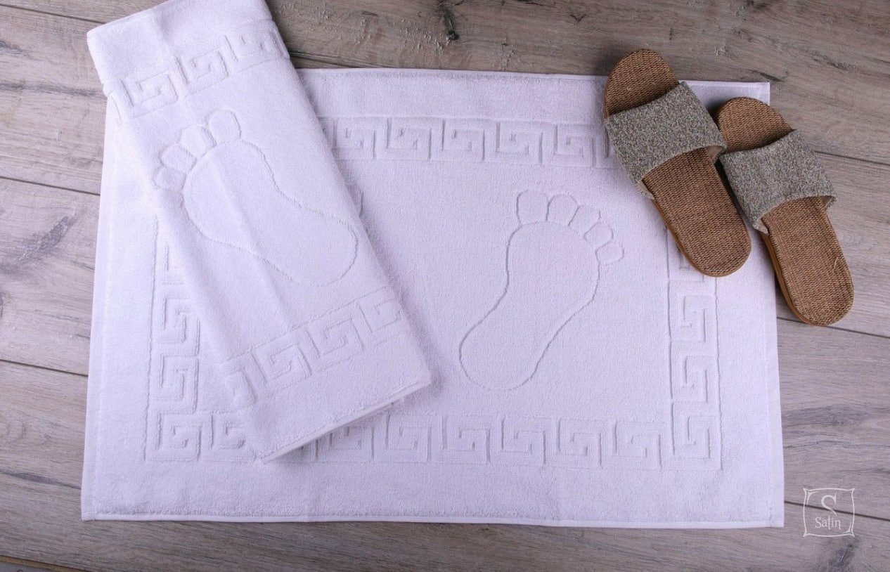 Полотенце для ног Аиша Ножки прямоугольной формы выполнено в белом цвете с жаккардовым рисунком прекрасно смотрится, долговечно, отлично стирается, плотность - 650 г/м2. Изготовлено в Узбекистане.