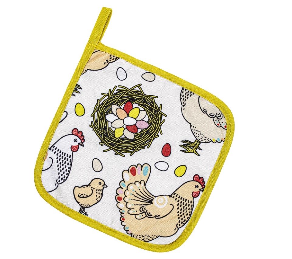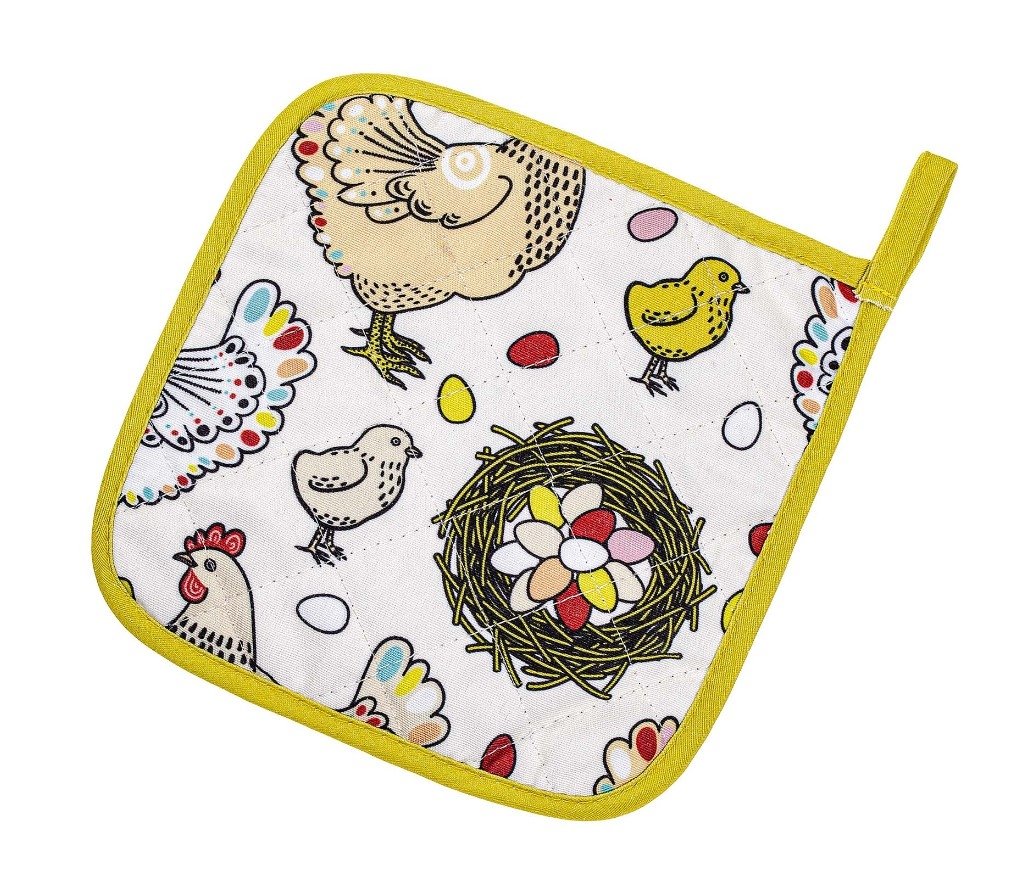 Прихватка для кухни Home Line Курочки выполнена из габардина с принтом курочки, цыплята и гнездо.