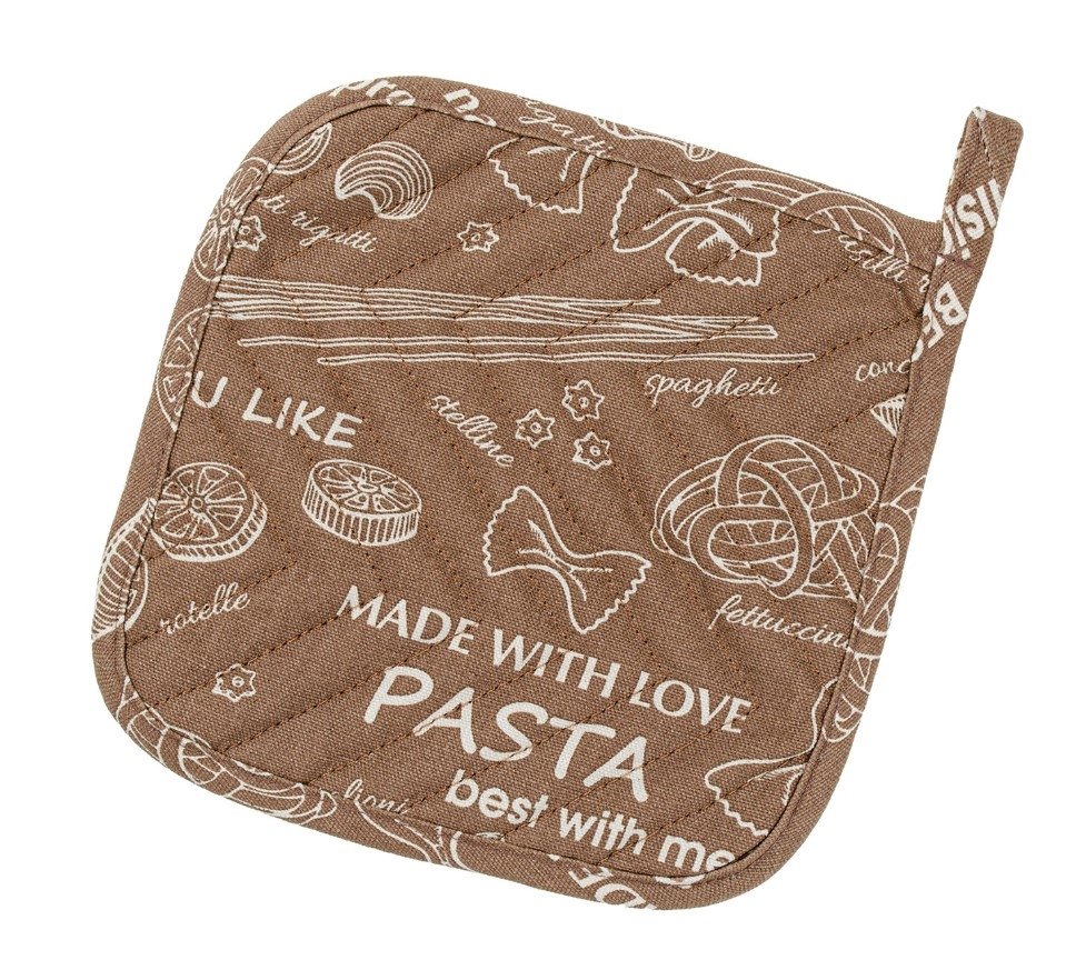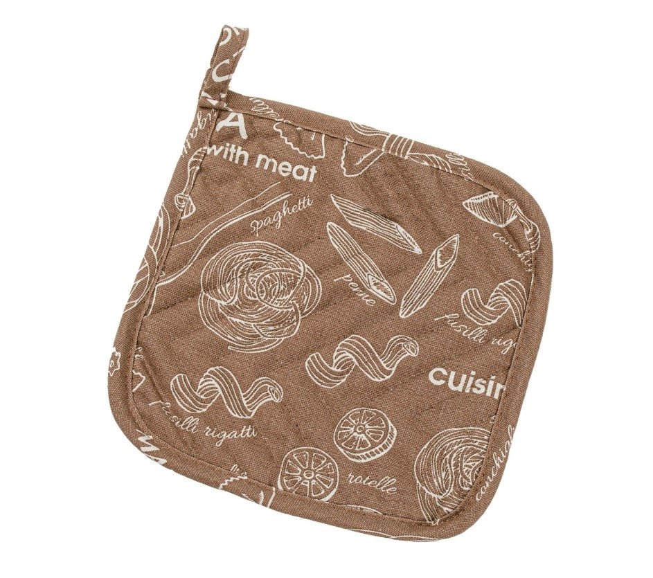 Прихватка Home Line Паста выполнена в светло-коричневом цвете с узором разных видов пасты и надписями. Станет верным помощником и стильным аксессуаром на кухне.