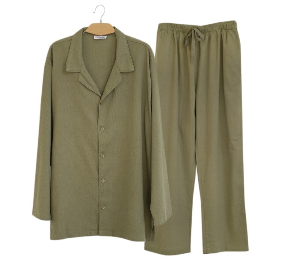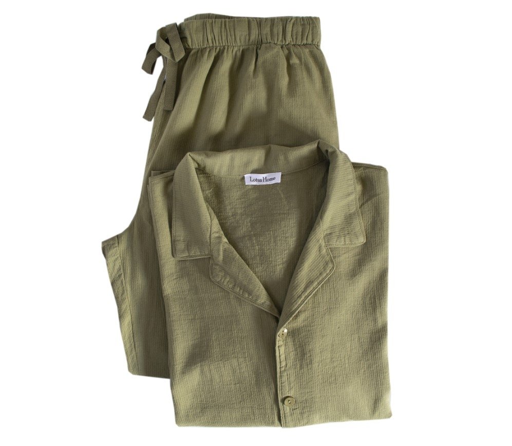 Пижама мужская Lotus Home Porta выполнена из 100% хлопка в оливковом цвете. Рубашка на пуговицах, имеет двубортный воротник и боковые нижние разрезы. Брюки прямого кроя с резинкой и утяжками на талии, изделие имеет два боковых кармана.