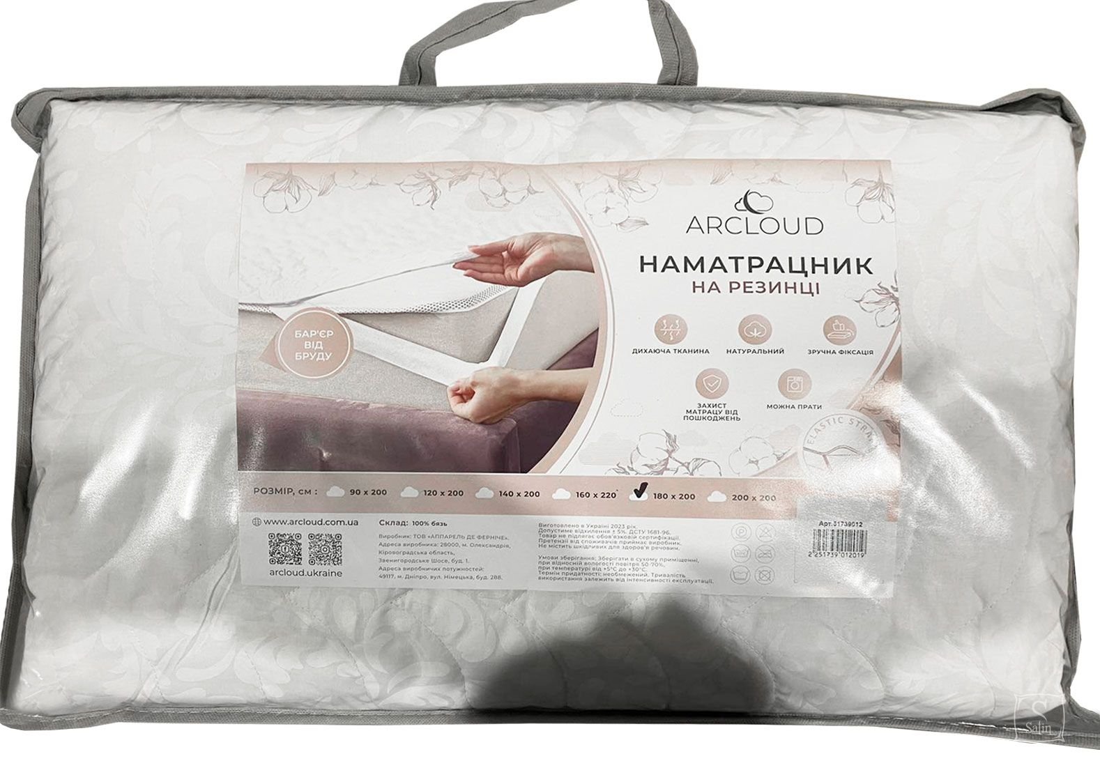 Наматрасник ArCloud Хлопковый на резинках – легкий, мягкий, экологичный и гипоаллергенный. Крепится к матрацу с помощью резинок, расположенных на углах изделия. Чехол: бязь с жаккардовым рисунком (хлопок 100%). Наполнитель: холофайбер (антиаллергенное волокно), плотность - 80 г/м². Упаковка – полиэтиленовый пакет.