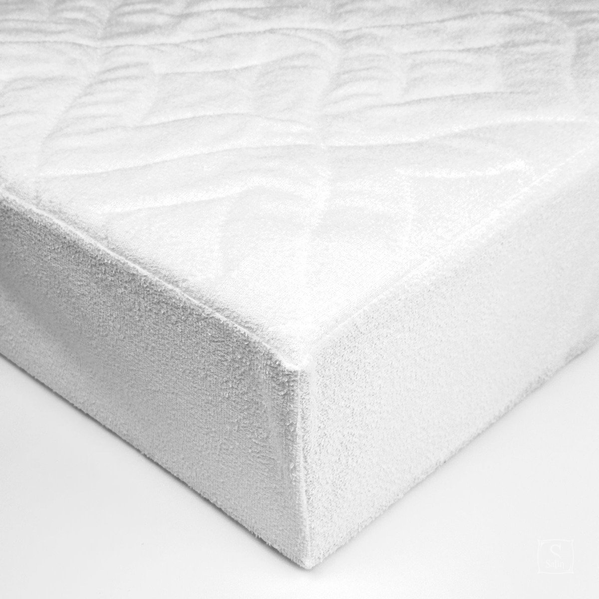 Водонепроницаемая, дышащая, эластичная махровая ткань, используемая в этих изделиях, предотвращает появление всех видов загрязнения, защищая Ваш матрас. Трикотажный махровый верх с равномерным устойчивым ворсом имеет отличное свойство впитывать жидкость, не давая ей распространиться по всей поверхности. А специальная полиуретановая мембрана с внутренней стороны защитит Ваш матрас не давая влаге проникнуть сквозь неё. Узор, который наноситься при помощи тефлона придает изделию нежного и красивого вида. Вставка из силиконизированного волокна, просто необходима для людей, которые имеют аллергическую реакцию на продукты натурального (животного) происхождения.