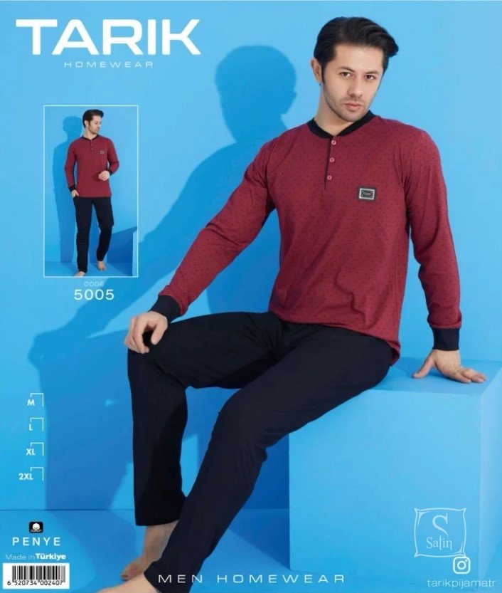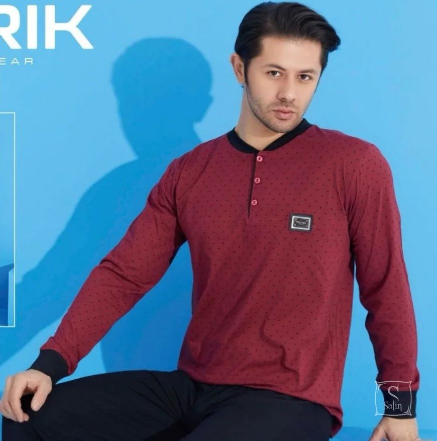 Пижама мужская Tarik Модель 5005 состоит из трикотажной хлопковой футболки на поуговицах с днинными рукавами и длинных штанов. Является прекрасной одеждой для дома и отдыха.