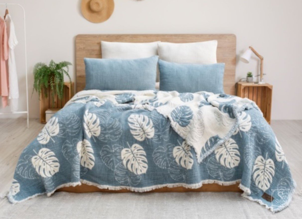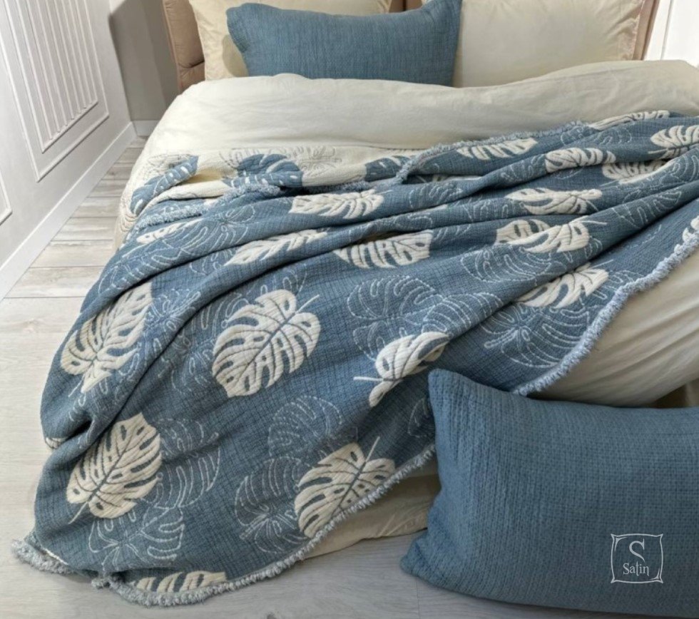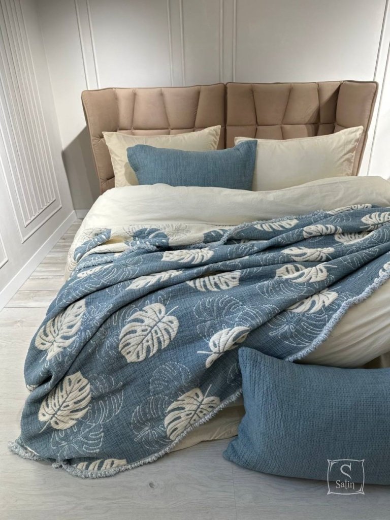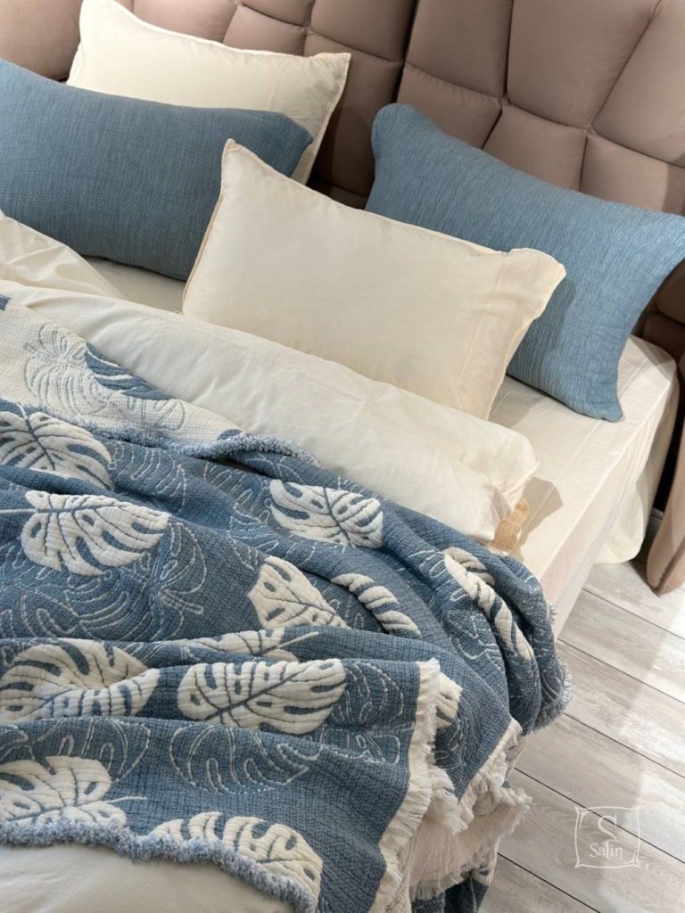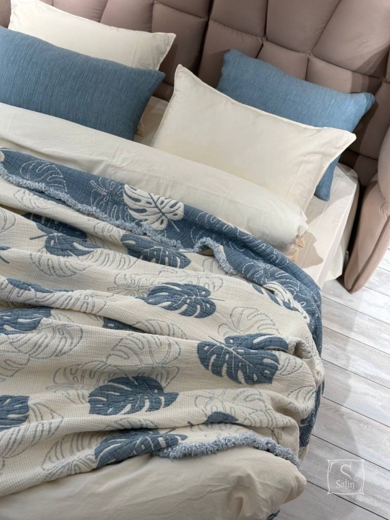 Муслиновое покрывало с наволочками Saheser Forest mavi из муслина (100% хлопок) в бежево-синем цвете, с узором листья.