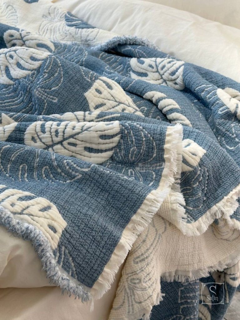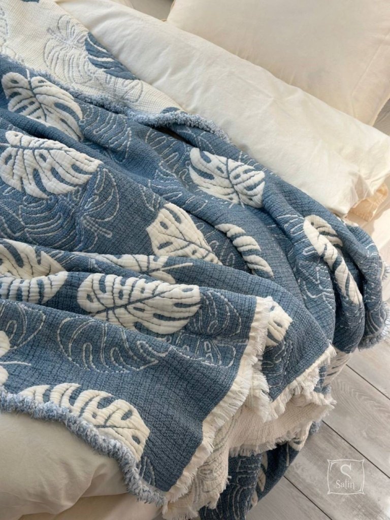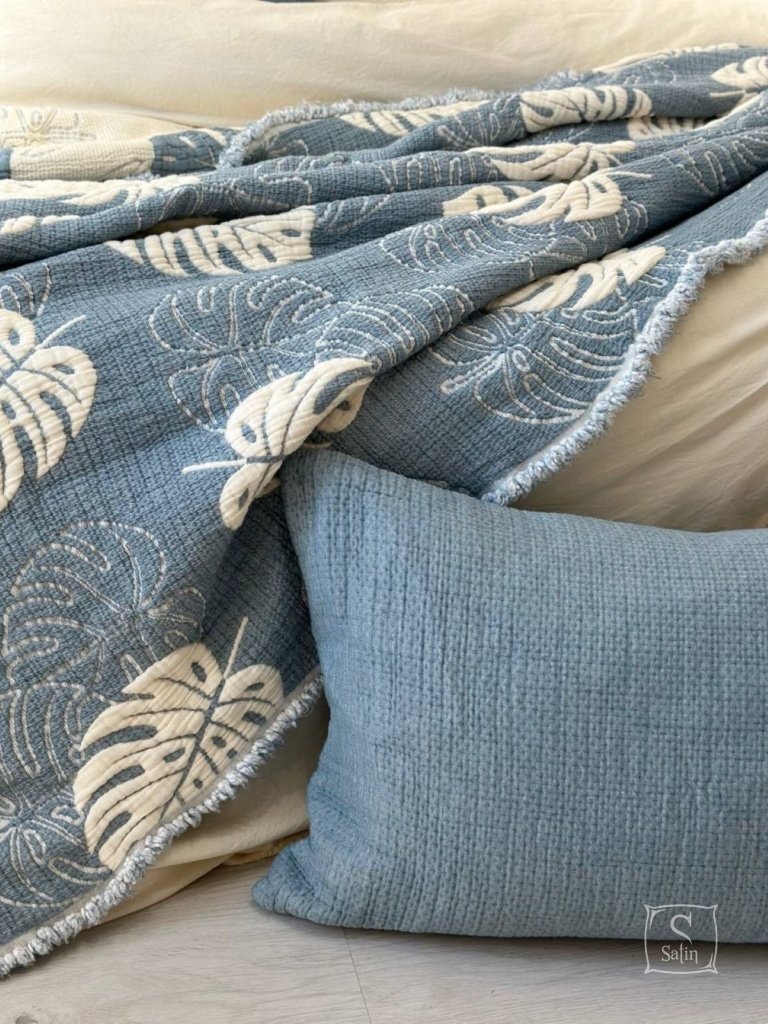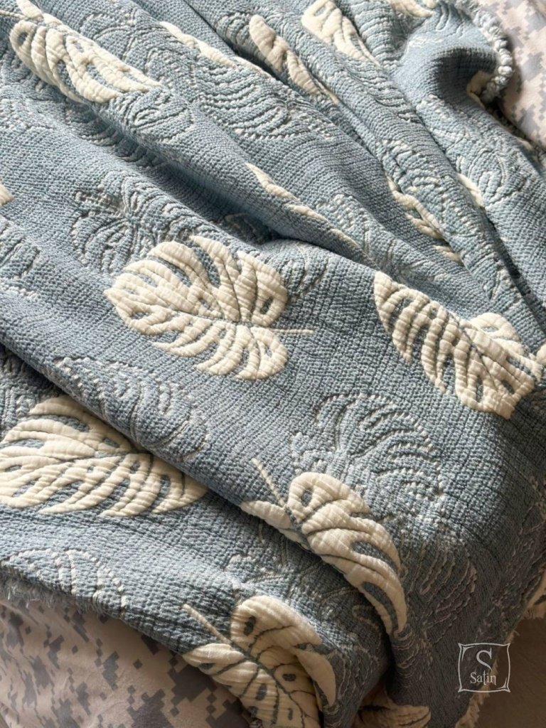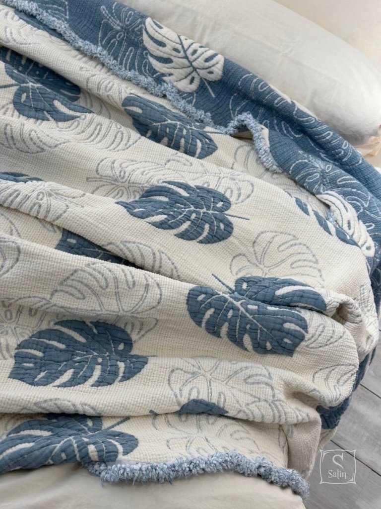 Муслиновое покрывало с наволочками Saheser Forest mavi из муслина (100% хлопок) в бежево-синем цвете, с узором листья.