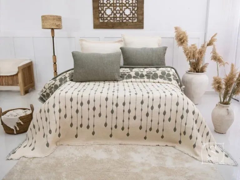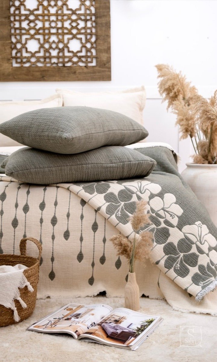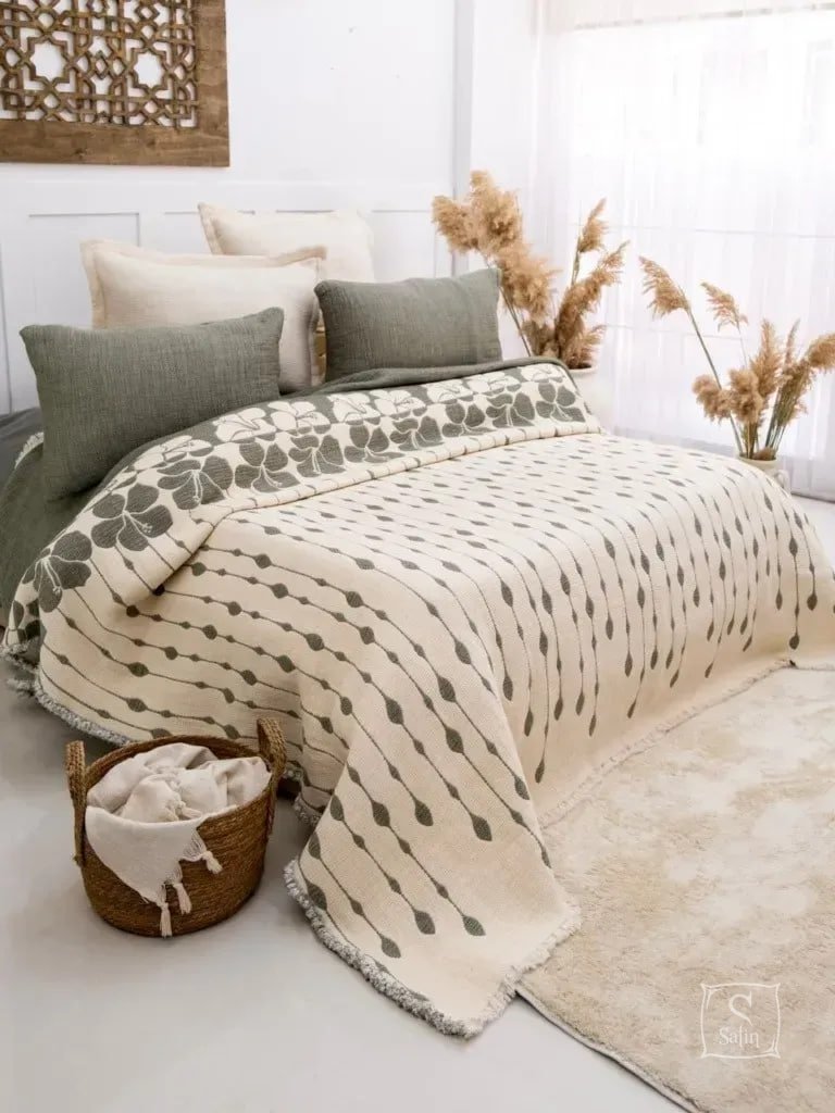 Муслиновое покрывало с наволочками Saheser Sole Haki из муслина (100% хлопок) в кремово-зеленом цвете с абстрактным узором.