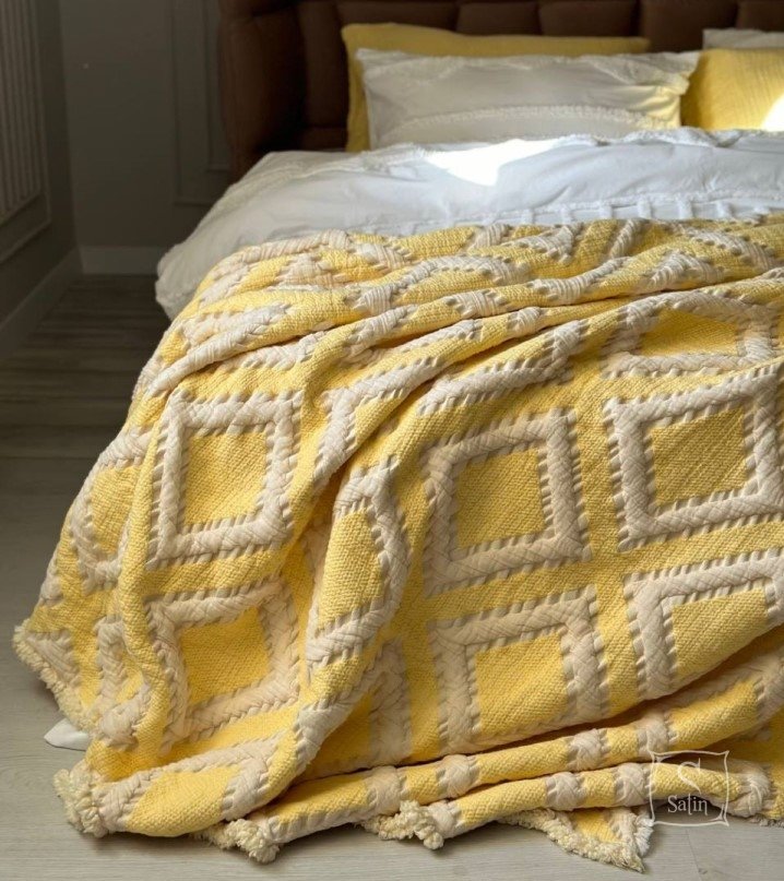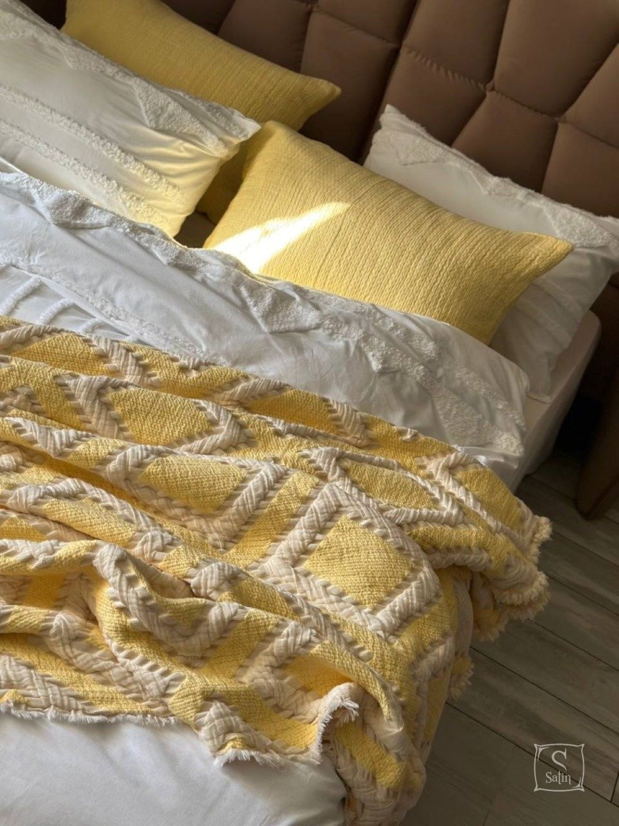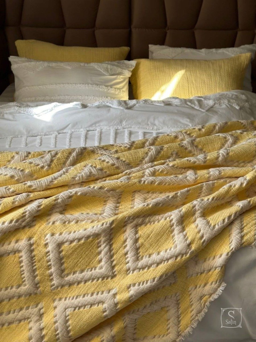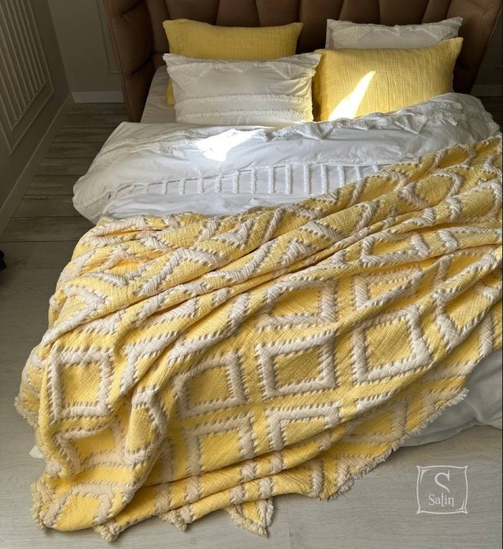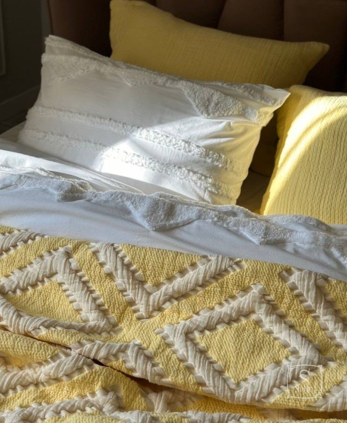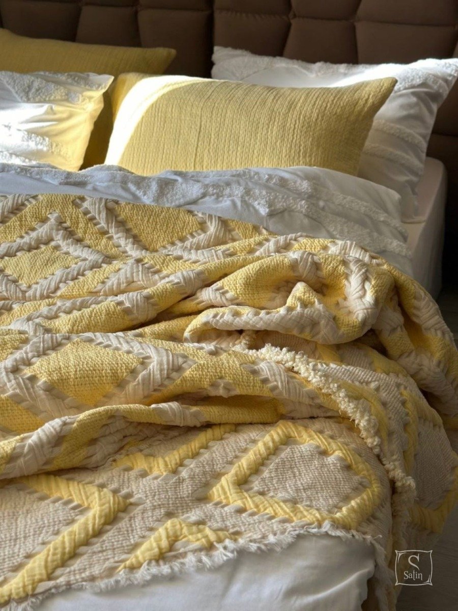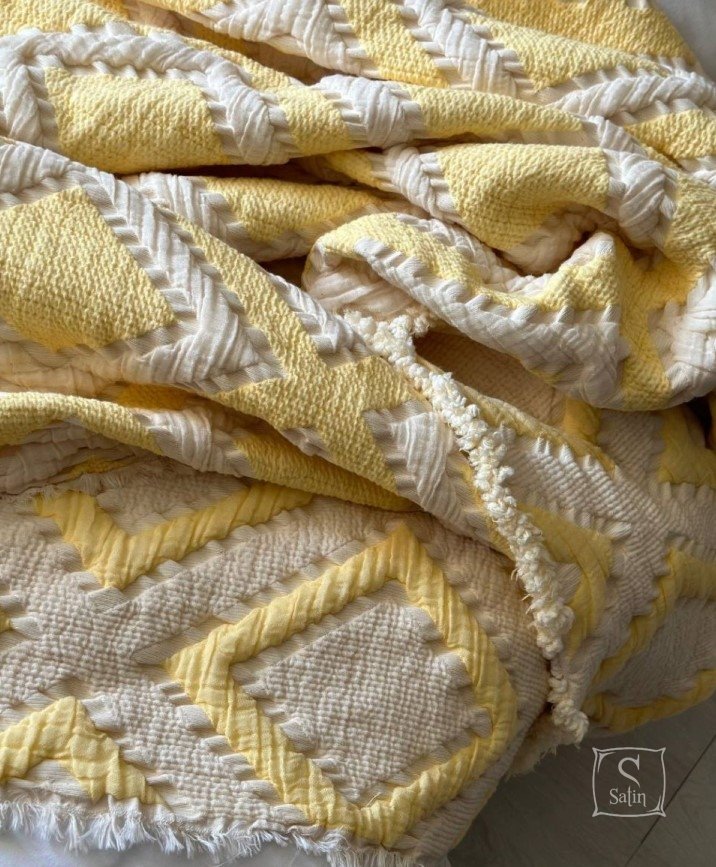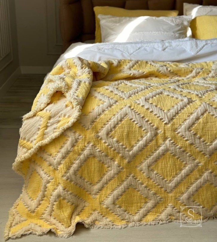 Муслиновое покрывало с наволочками Saheser Sonia krem-yellow из муслина (100% хлопок) в кремово-жёлтом цвете, с узором ромбы.