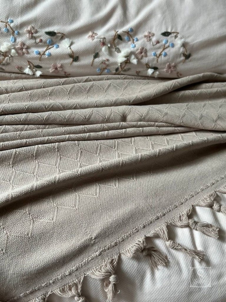 Натуральный, легкий плед-пике с бахромой Saheser Bari bej из 100% хлопка в бежевом цвете, с оригинальным геометрическим узором.