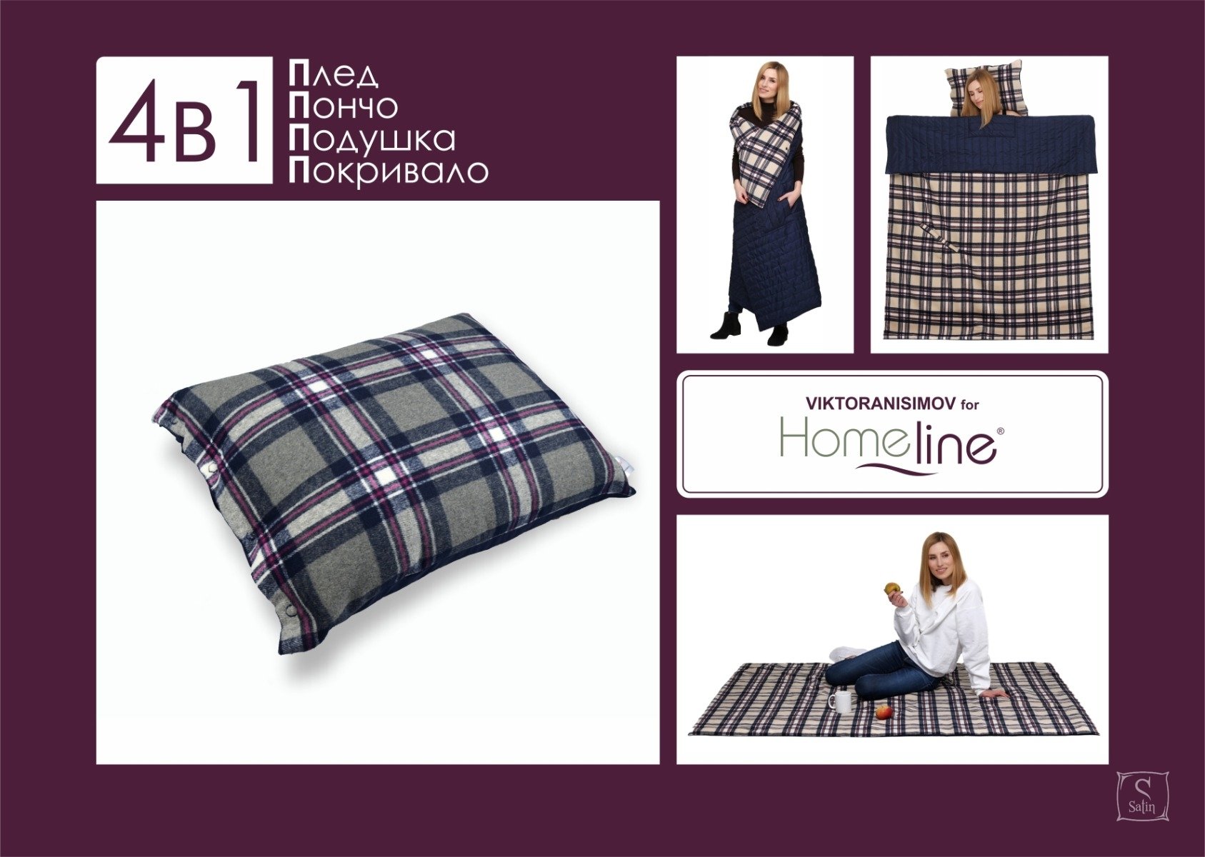 Трансформер 4в1 плед-одеяло-пончо-подушка Home Linе оформлено в клетку в сдержанных серо-синих тонах с яркими синими полосами. Размер подушки 47х35х13 см.