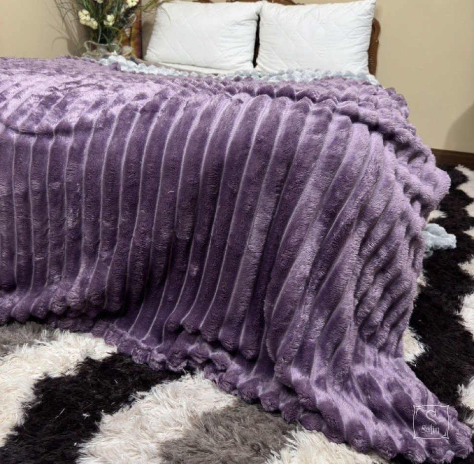 • Плед-покрывало Koloco Шарпей королевская полоска фиолетового цвета с небольшим ворсом и оригинальным рельефным узором, ширина полоски - 3 см, выполнен из ткани Wellsoft - мягкая кань с невысоким плотным блестящим ворсом, состав ткани - 100% полиэстер.