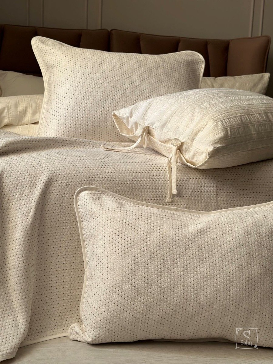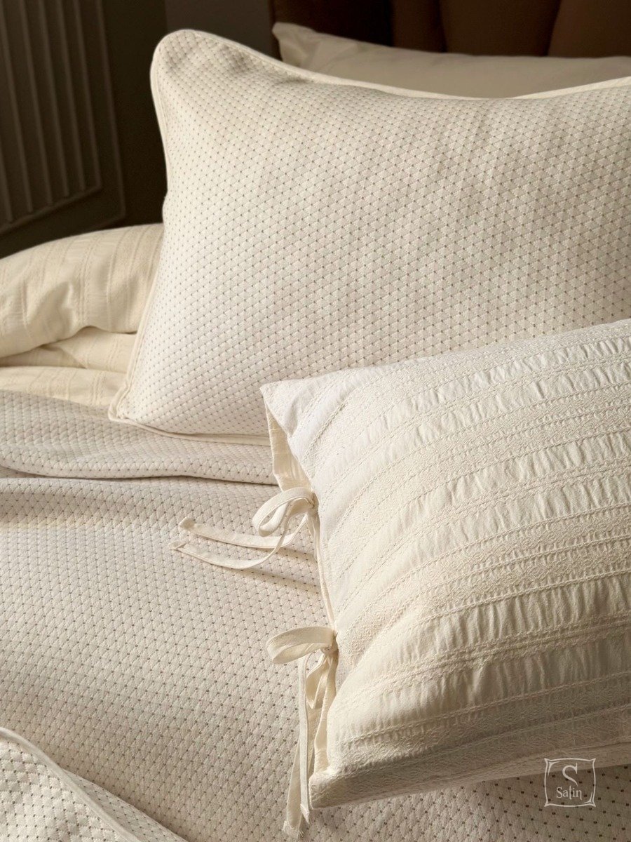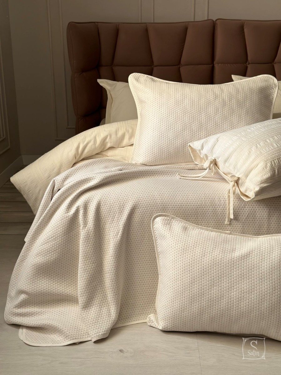 Жаккардовое покрывало с наволочками Saheser Liv cream из 100% хлопка кремового цвета, с геометрическим узором.