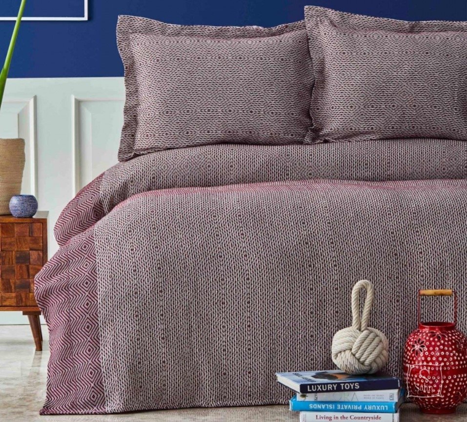 Очень красивый и стильный комплект Carla bordo от турецкой ТМ Nautica Home состоит из роскошного покрывала и двух наволочек с ушками, выполнен в бордовом цвете, украшен геометрическим узором.