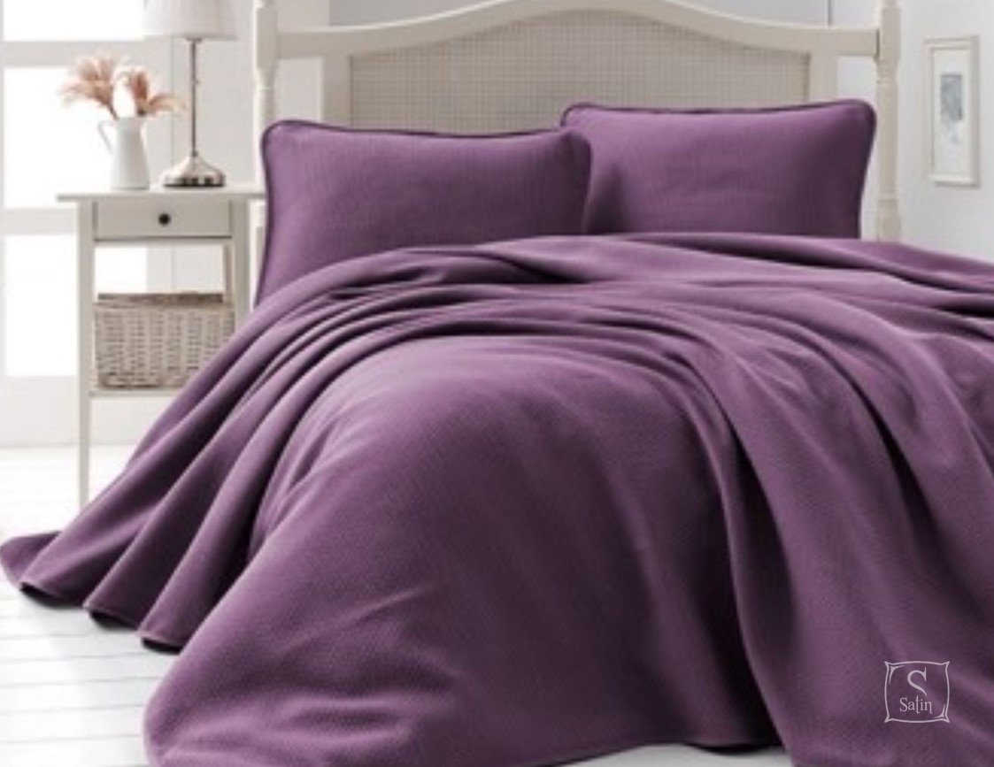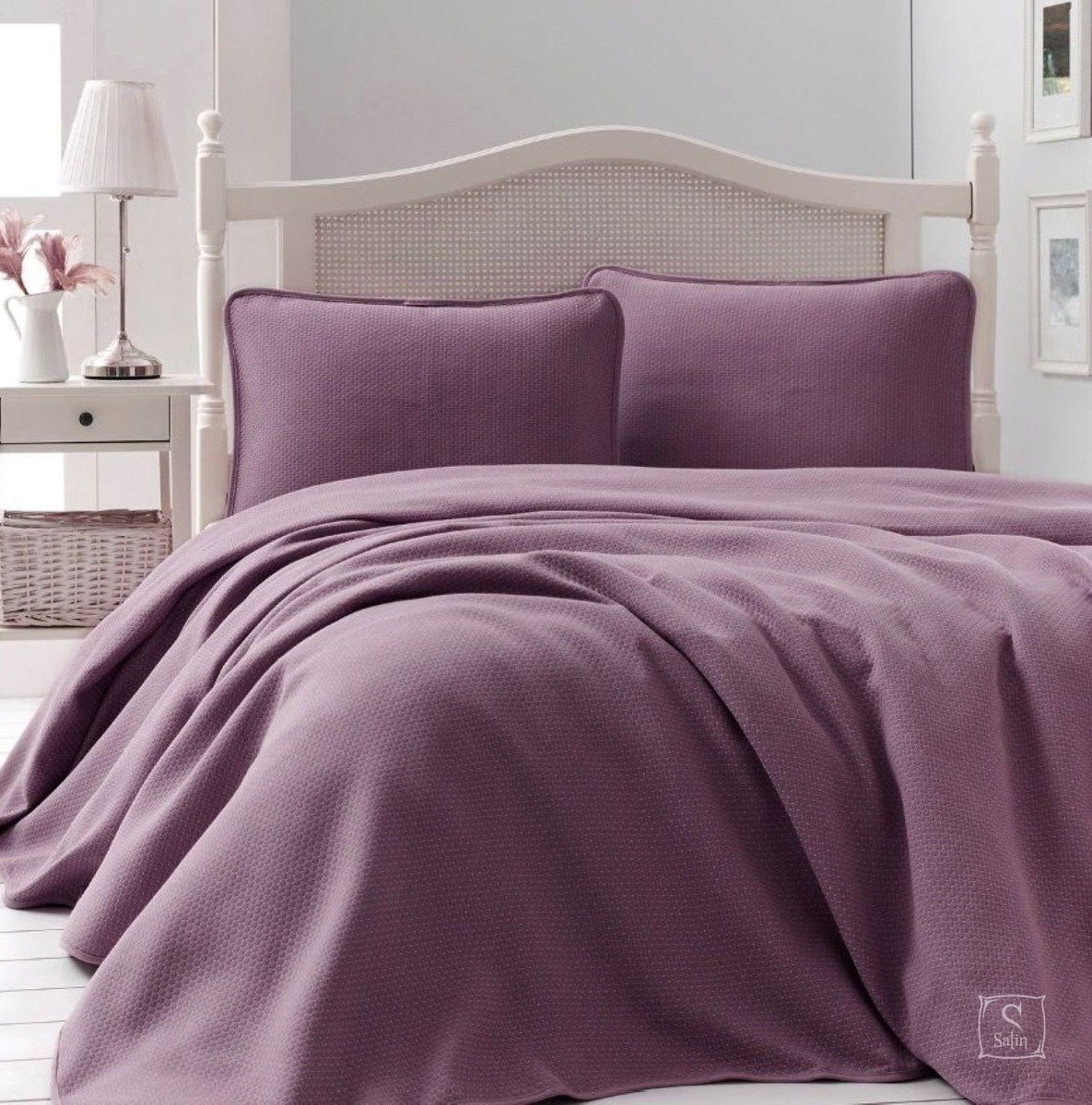 Жаккардовое покрывало с наволочками Saheser Liv plume из 100% хлопка фиолетового цвета, с геометрическим узором.