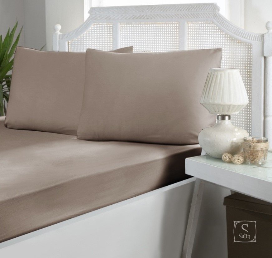 Простыня на резинке с двумя наволочками First Choice Сатин Mink выполнена в однотонном коричневом цвете из сатина (100% хлопок).