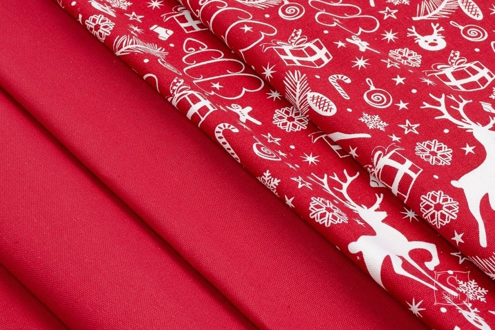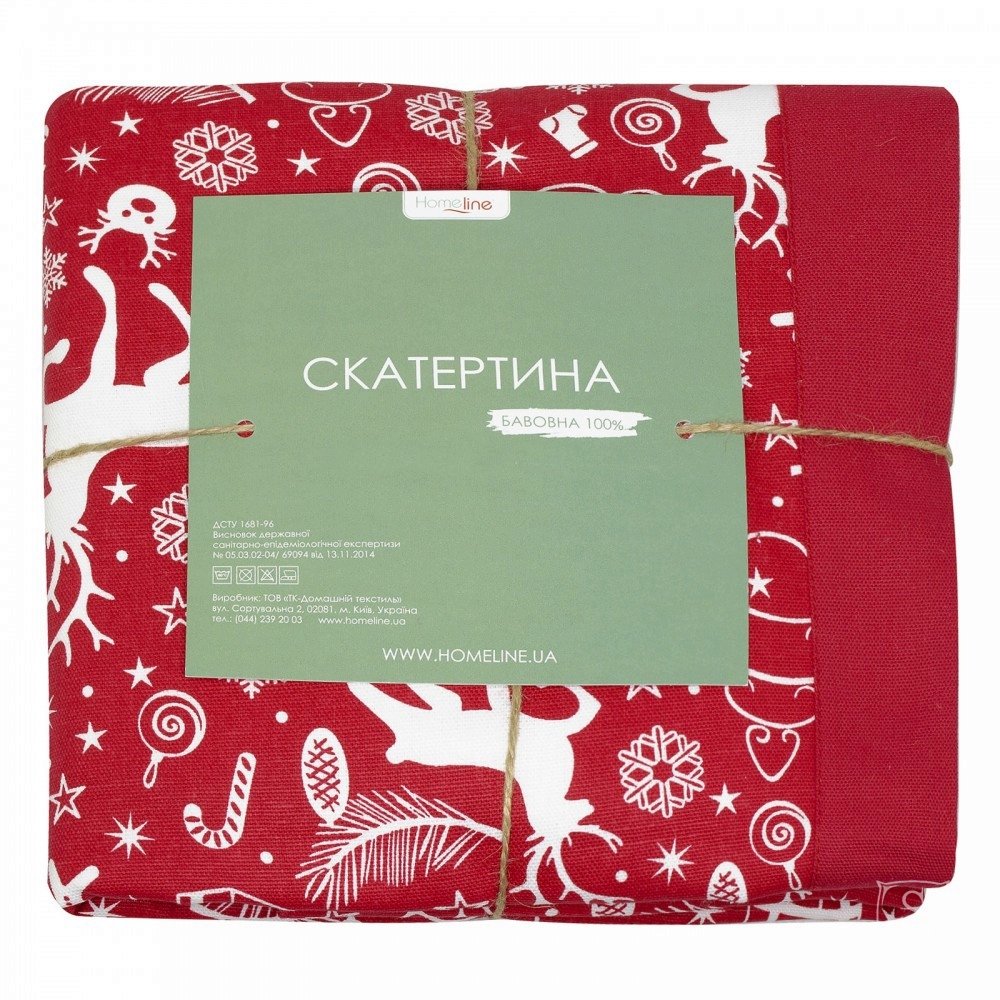 Нарядная скатерть Home Line красного цвета с новогодним узором. Данная скатерть прекрасно подходит для оформления стола и создания уюта в Вашем доме. Изделие по своему дизайну превосходно подходит для домов, гостиниц, пансионатов, домов отдыха, ресторанов, кафе, баров, офисов и других жилых и общественных помещений. Ткань - полупанама для столового белья, 100% хлопчатобумажная плотность 195 г/м2. Ткань на ощупь приятная, мягкая, с однородной гладкой структурой полотна, вид плетения напоминает рогожку. На поверхности четко видны расположенные в шахматном порядке прямоугольники, которые образуются благодаря двойному или тройному переплетению нитей. Такая ткань более плотная и износостойкая, чем рогожка или бязь, превосходно подходит для кухонного текстиля. На такой ткани лучше смотрится рисунок из-за однородности поверхности.
