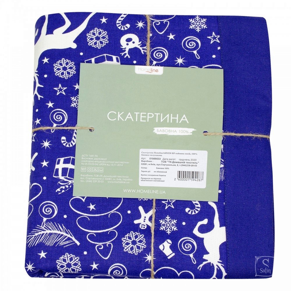 Нарядная скатерть Home Line синего цвета с новогодним узором. Данная скатерть прекрасно подходит для оформления стола и создания уюта в Вашем доме. Изделие по своему дизайну превосходно подходит для домов, гостиниц, пансионатов, домов отдыха, ресторанов, кафе, баров, офисов и других жилых и общественных помещений. Ткань - полупанама для столового белья, 100% хлопчатобумажная плотность 195 г/м2. Ткань на ощупь приятная, мягкая, с однородной гладкой структурой полотна, вид плетения напоминает рогожку. На поверхности четко видны расположенные в шахматном порядке прямоугольники, которые образуются благодаря двойному или тройному переплетению нитей. Такая ткань более плотная и износостойкая, чем рогожка или бязь, превосходно подходит для кухонного текстиля. На такой ткани лучше смотрится рисунок из-за однородности поверхности.