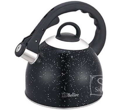 Чайник для плиты Bollire BR-3009 изготовлен из нержавеющей стали. Мраморная покраска корпуса выглядит презентабельно, сам он выдержан в черном оттенке. Бакелитовые ручка приятная на ощупь и мягкая. Чайник имеет бакелитовый свисток со стальной сердцевиной и устройством для открывания носика на ручке. У чайника есть функция открытия носика в одно нажатие, что облегчает процесс эксплуатации. Посуда Bollire простая в уходе и быстро отмывается от загрязнений разной сложности.