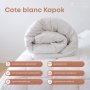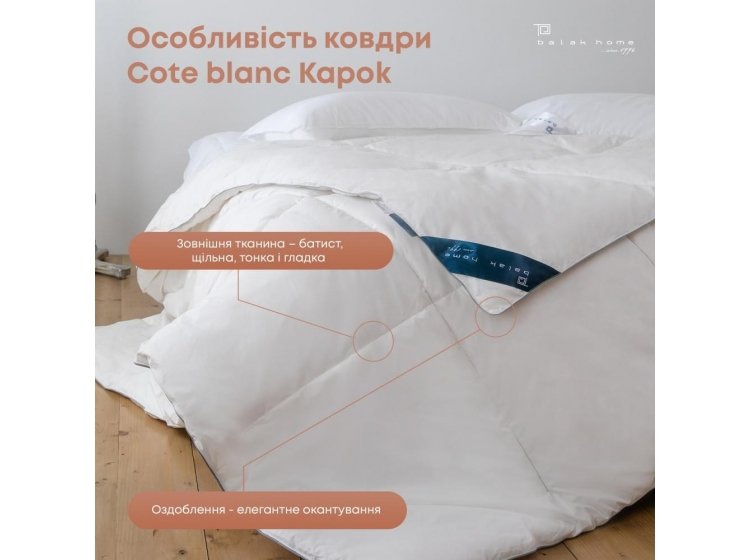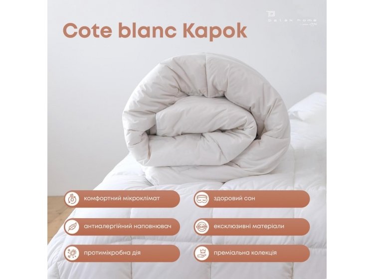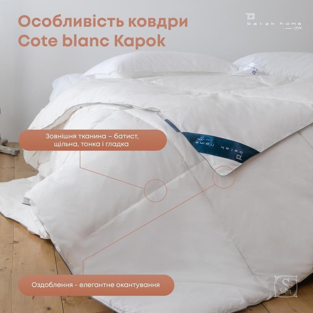 Ковдра ТЕП. COTE BLANC kapok batist виконано з наповнювачем капок комфортне та тепле. Волокна капок блискучі, жовтувато-коричневі та виготовлені із суміші лігніну та целюлози. Кожне волокно має довжину близько 2,5 см, має широкий просвіт (центральну порожнину) та тонкі стінки, вкриті водостійким воском. Ця незвичайна комбінація дає волокну капок деякі чудові характеристики. 1 . Легка вага: порожниста серцевина робить капок дуже легким, у 8 разів легше бавовни за обсягом. Капок протистоїть комкованию (тобто не стає комковатым), після відмивання він також повертається до початкової формі.