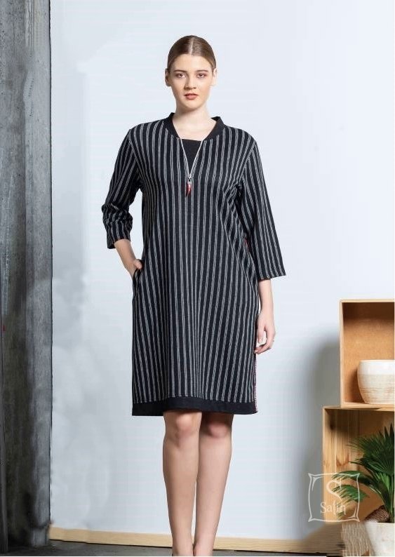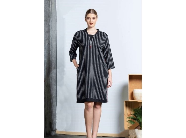 Сукня-туніка Cocoon 22-2684 представлена у чорно-сірому кольорі у вертикальну смужку. Модель із віскози, приємна до тіла, з рукавами 3/4 та кишенями. Комір декорований невеликою блискавкою. Є чудовим зручним та ошатним одягом для дому, відпочинку. Чудовий крій та оригінальна модель дозволять вам виглядати бездоганно.