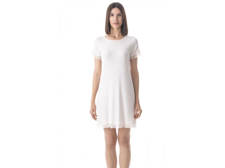Футболка-сорочка для сну з модалу з мереживом German Volf 24082 в молочному кольорі - це гармонійне поєднання вишуканості, комфорту та практичності. Модал, з якого виконана сорочка, - це натуральний матеріал, що має чудові властивості: м'якість, шовковистість, повітропроникність і висока зносостійкість. Завдяки цим характеристикам, сорочка забезпечує комфортний сон, зберігаючи відчуття легкості та свіжості протягом усієї ночі. Модал добре вбирає вологу, що робить його ідеальним для нічного одягу будь-якої пори року.