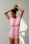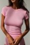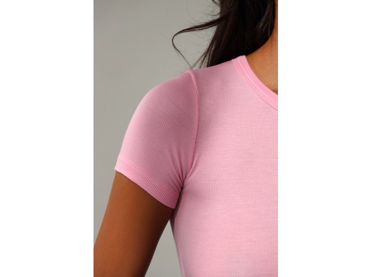 Дизайн футболки в рубчик надає їй особливого шарму і структури. Завдяки рубчастій текстурі тканина виглядає стильно і підкреслює витонченість силуету, надаючи образу елегантності. Ніжний рожевий колір надає моделі романтичності та легкості, що робить її чудовим вибором для створення жіночих, стильних образів. Цей відтінок добре поєднується з іншими квітами, додаючи свіжості та природної ніжності у будь-який образ.