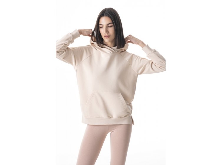Бежевий колір універсальний і легко комбінується з іншими елементами одягу, джинси, спортивні штани або легінси. Простора кишеня-кенгуру додає практичності, а манжети на рукавах і внизу худі забезпечують ідеальну посадку.