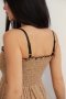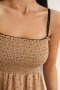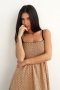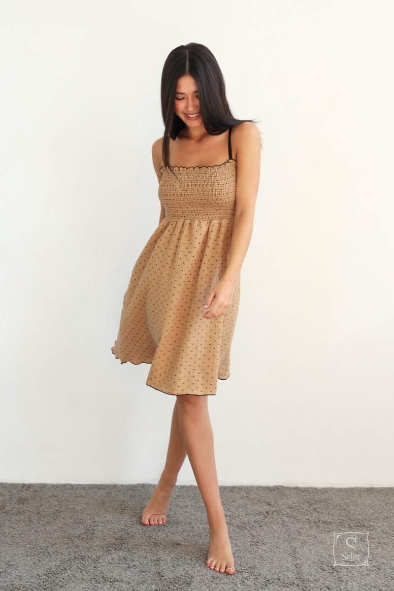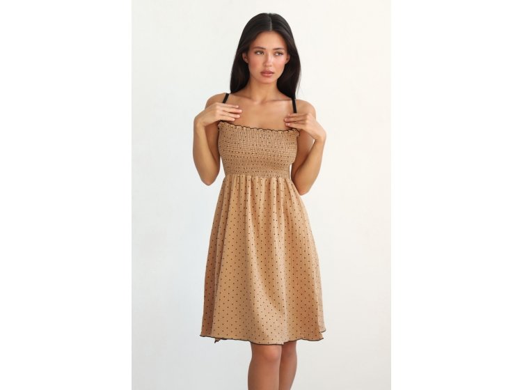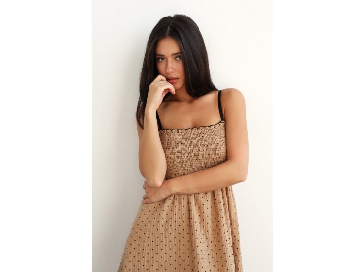 Ніжний відтінок з контрастним чорним горошком надає сарафану елегантного вигляду та легкого ретро-шарму. Горошок – це вічний принт, що надає образу грайливості та витонченості, а у поєднанні з м'яким коричневим кольором цей дизайн виглядає сучасно та стильно. Такий відтінок універсальний і підходить для будь-якого типу зовнішності, надаючи образу ніжності та одночасно роблячи його яскравим та привабливим.